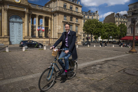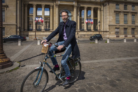 Stein van Oosteren sur son vélo devant l'Assemblée Nationale à Paris. Il est l'auteur du livre "Pourquoi pas le vélo" et président de l'association cycliste Faravelo près de Paris. Paris, France, 7 mai, 2021.