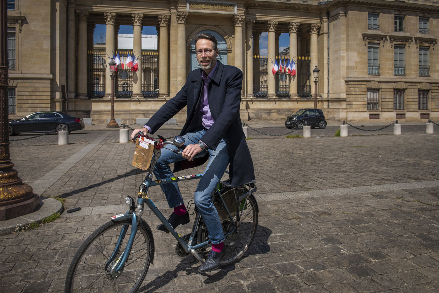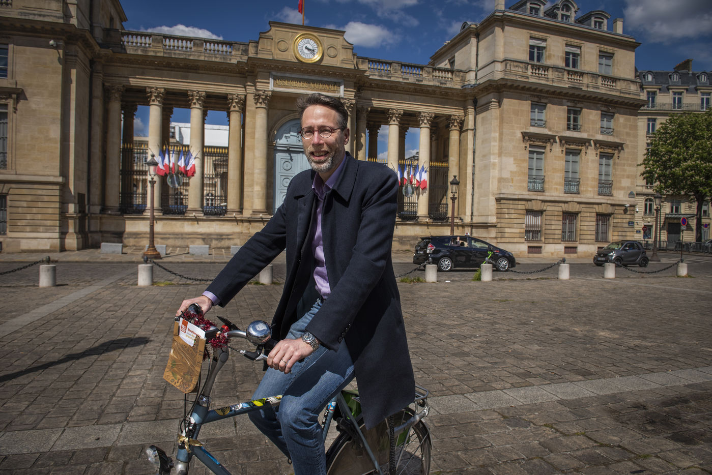 Stein van Oosteren bikes in front of the Assemblée Nationale in Paris. He is the author of the book "Pourquoi pas le velo" and president of bicycle association near Paris., Paris, France, May 7, 2021.