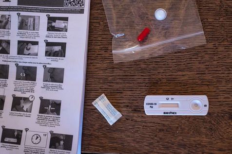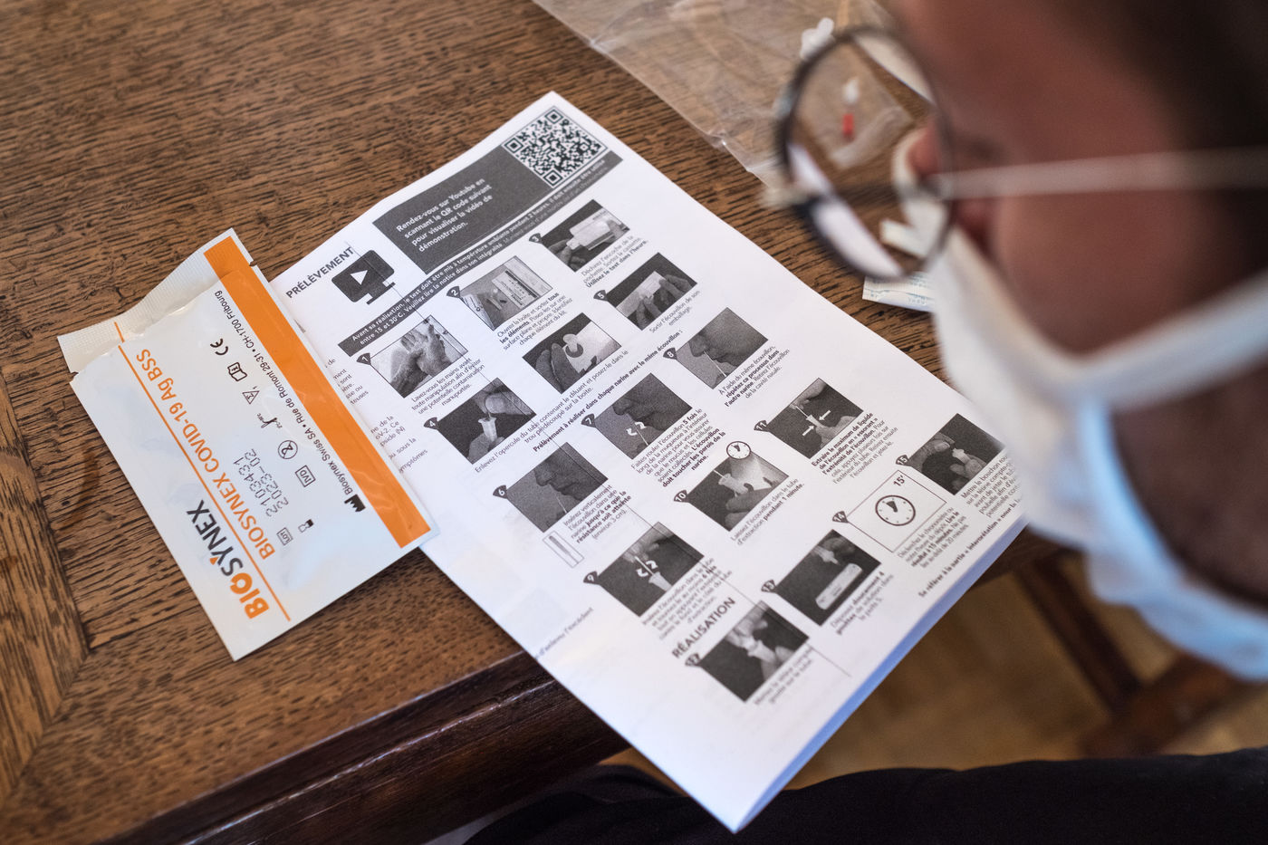 Quimper, April 24, 2021, carrying out a COVID-19 self-test at home. These tests are accessible to all and available in pharmacies.
