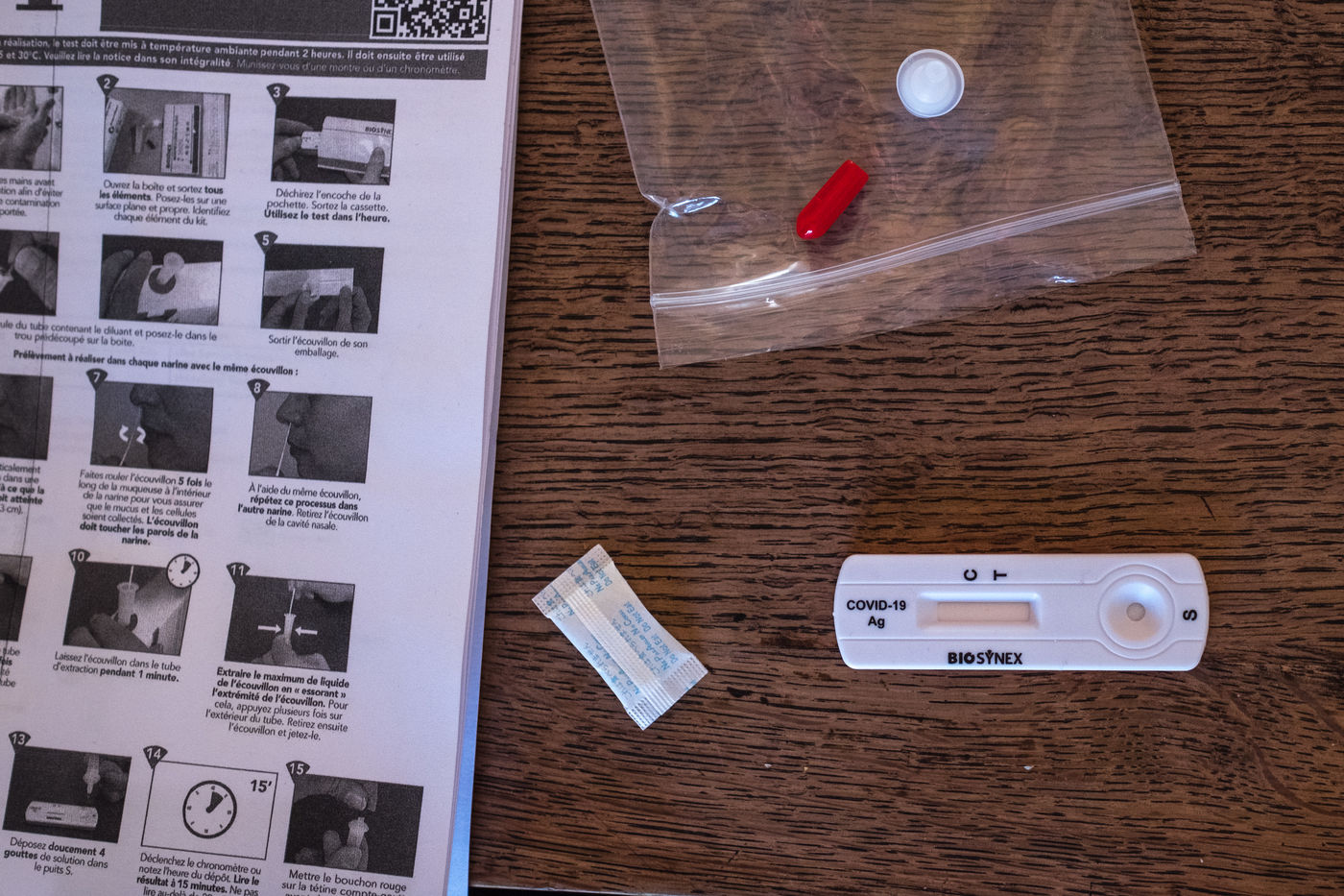Quimper, 24 avril 2021, réalisation d'un autotest COVID-19 a la maison. Ces tests sont accessibles à tous et disponible en pharmacie.