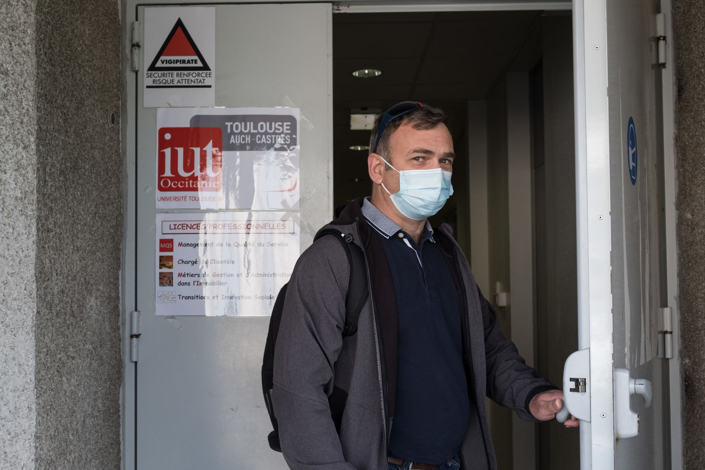 Nicolas Savy, Maitre de Confe?rences Universitaires a? l?Institut de Mathe?matique de Toulouse et enseignant a? l?IUT, jongle entre le te?le?travail, son bureau a? l?IMT et les cours en visioconfe?rence.