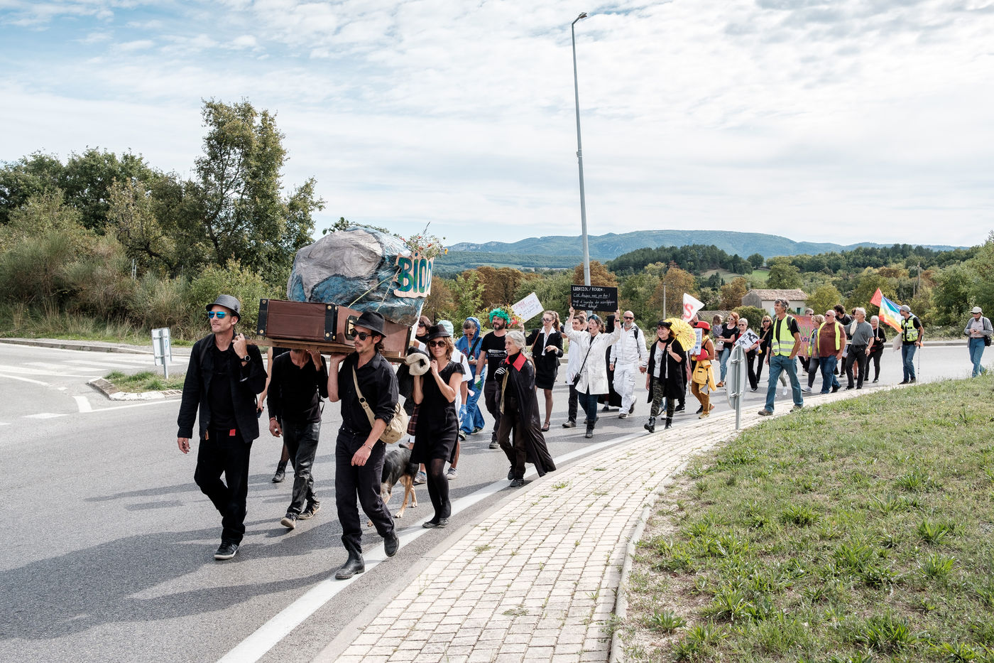 In the city of the Minister of the Interior, Forcalquier, a few hundred people gathered for a demonstration in the form of a "Carnival of the End of the World", on the eve of the launch of the October International Rebellion (RIO), which must see many actions of mobilization in favor of the living world. At the call of the local Rebellion Extinction group, other groups joined the demonstration (Yellow vests, Attac...).