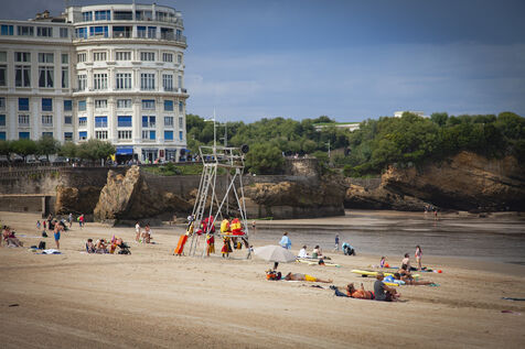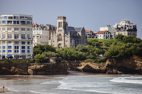 Biarritz, élégante ville balnéaire de la côte basque, dans le sud-ouest de la France, est une destination populaire depuis que les têtes couronnées de toute l'Europe l'ont choisie comme lieu de villégiature dans les années 1800. L'endroit est également prisé des surfeurs pour ses grandes plages et ses écoles de surf. Le rocher de la Vierge, emblème de Biarritz, est un affleurement rocheux surmonté d'une statue de la Vierge Marie. Accessible par une passerelle, le rocher offre une vue panoramique sur le golfe de Gascogne