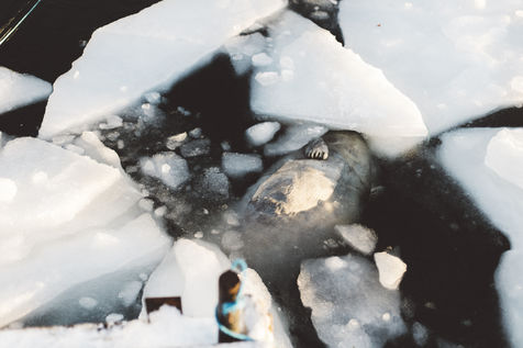 Après plusieurs heures de navigation, pas de traces de narvals. Les chasseurs rentreront au port déçu, malgré les quatre phoques qu'ils ont pu chasser. Une fois les bateaux solidement attachés, ils jettent les phoques à l'eau pour éviter qu'ils congèlent et les voilà partis se réchauffer quelques minutes.