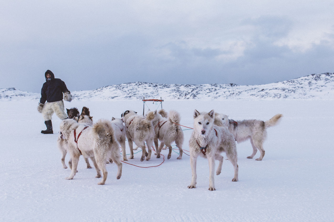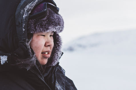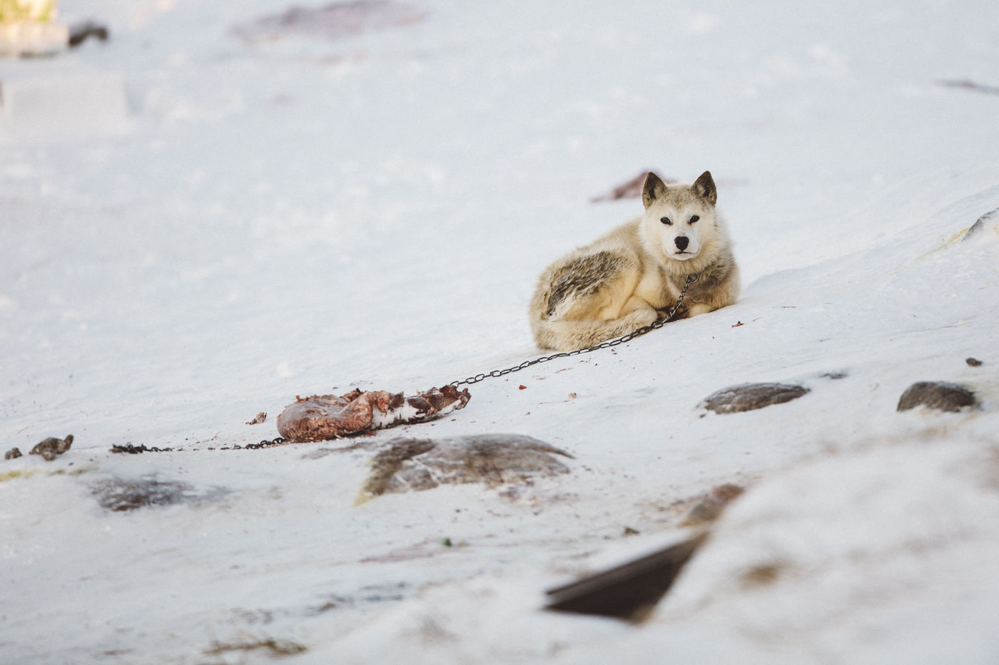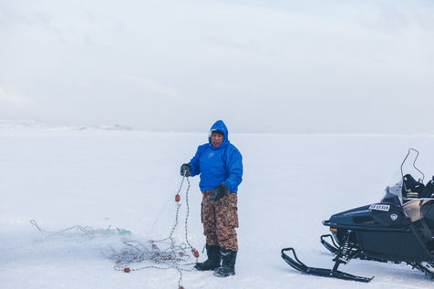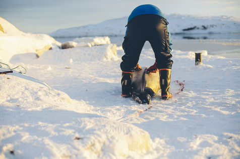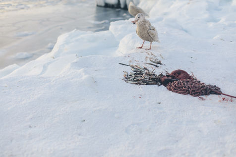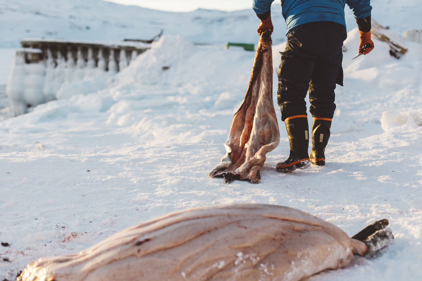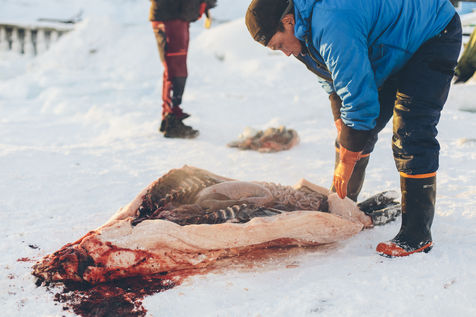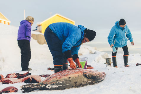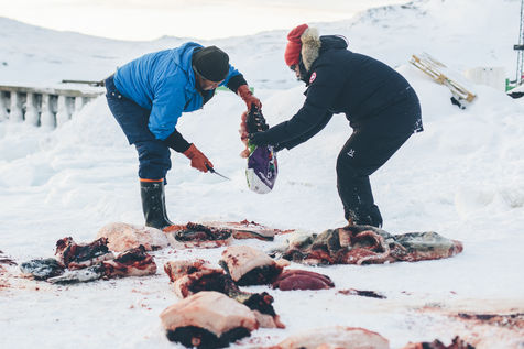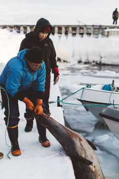 Lars Olsen, l'un des meilleurs chasseurs du villages a tué deux phoques du Groenland ce matin. Il les décharge avec l'aide de ses enfants, et les dépèce dans la neige, sous les cris affamés des goélands.