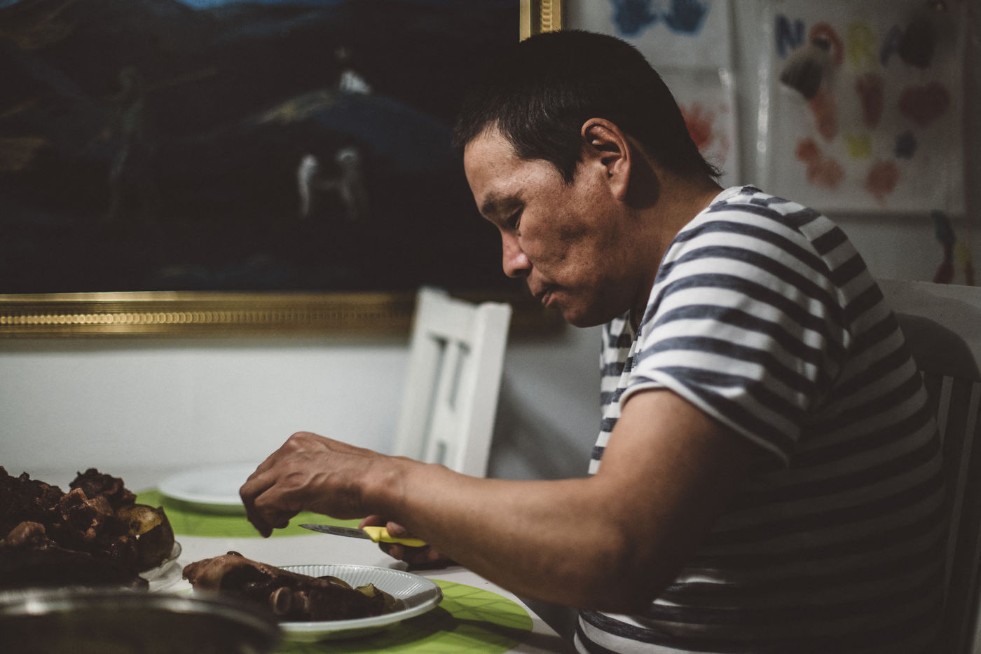 Après avoir enlevé la peau, qu'il vendra quelques euros dans un village voisin, il découpe l'animal. Déjà, les voisins sont assis à côté et ramènent un morceau de viande à la maison. Le foie, les reins et le pancréas seront réservé au chasseur, qui les dégustera crus. L'esprit de communauté est très fort dans ce village et chaque animal chassé est partagé entre tous ceux qui en ont besoin.