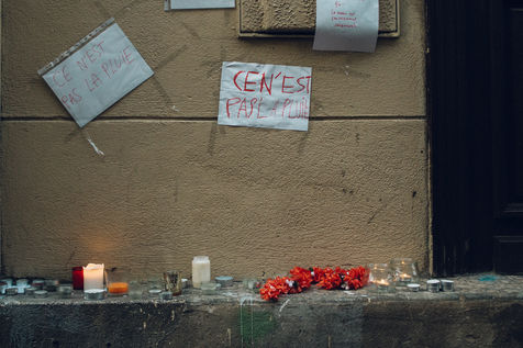 Par terre, au pied des barrières de police et devant les draps blanc qui masquent la scène, quelques bougies tremblotent. Des mots, collés aux murs, crient le chagrin et l'indignation : « Ce n'est pas la pluie ».