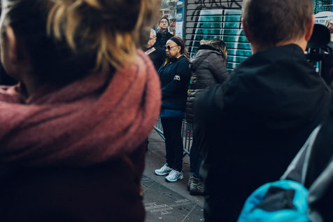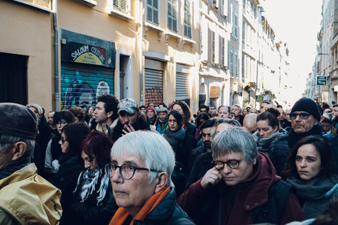5 décembre 2018. Marseille. France. À 9h05 ce 5 décembre, soit un mois pile après l'effondrement des immeubles de la rue d'Aubagne qui ont causés la mort de 8 personnes, un hommage a été rendu par les habitants du quartier aux personnes disparues. 8 minutes de silence ont été observées, ainsi qu'une supplémentaire en mémoire de Zineb Redouane, une femme de 80 ans décédée au cours d'une manifestation à cause d'une grenade lacrymogène de la police. Les habitants ont regrettés l'absence de personnalité de la mairie, leur silence et le manque d'accompagnement.