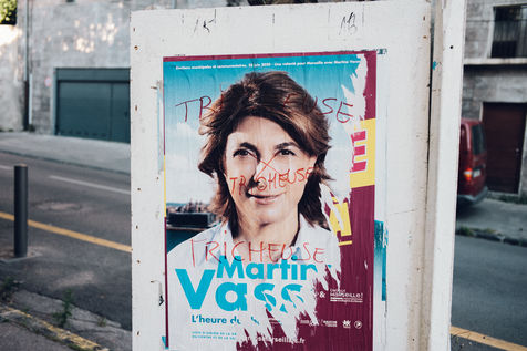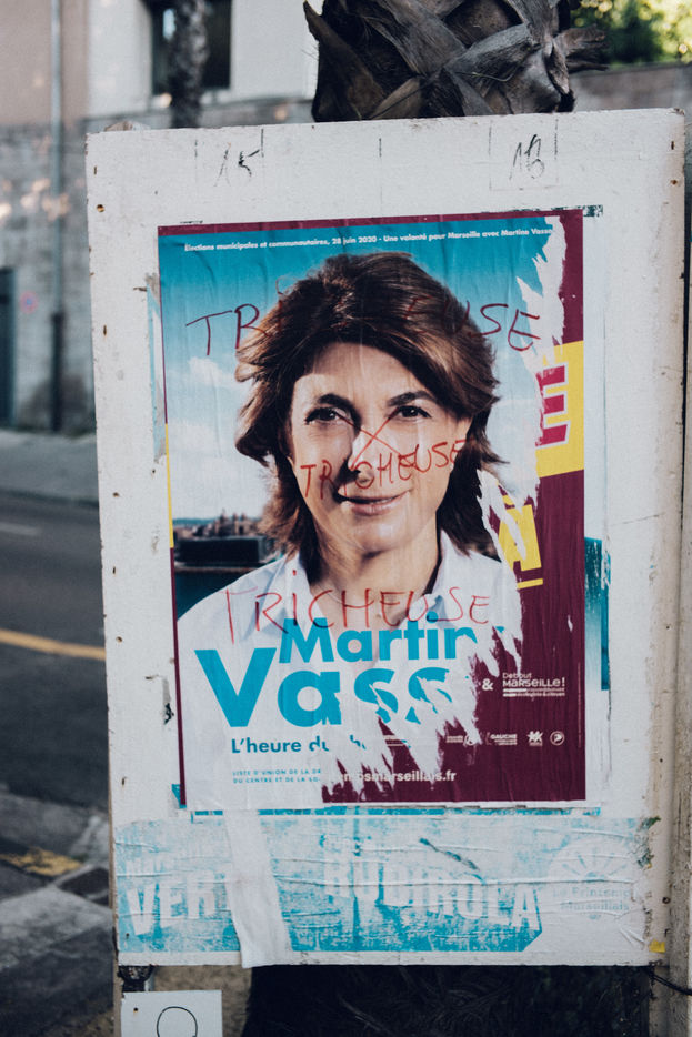 June 15, 2020. Marseilles. An electoral poster of the LR candidate in the municipal elections of the city of Marseille, Martine Vassal, tagged with the word "cheat" in reference to the accusations of cheating at the proxies that hang over her.