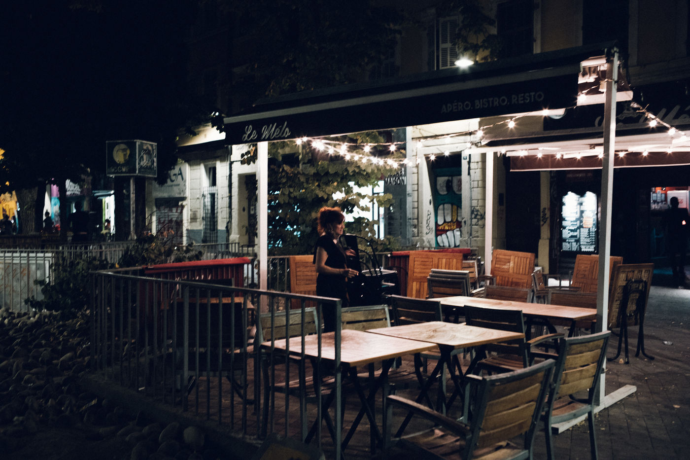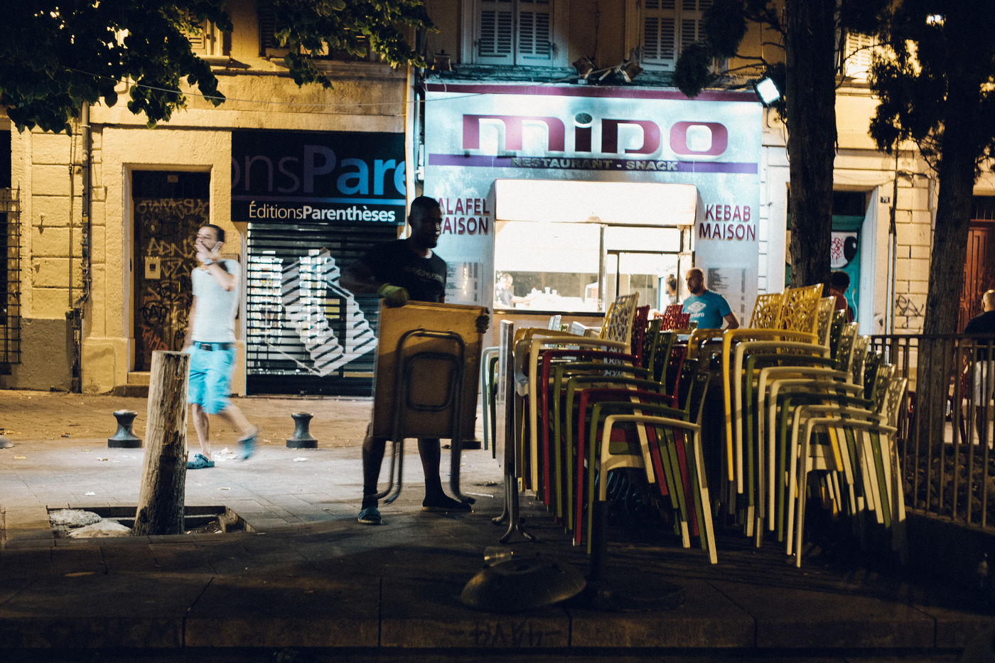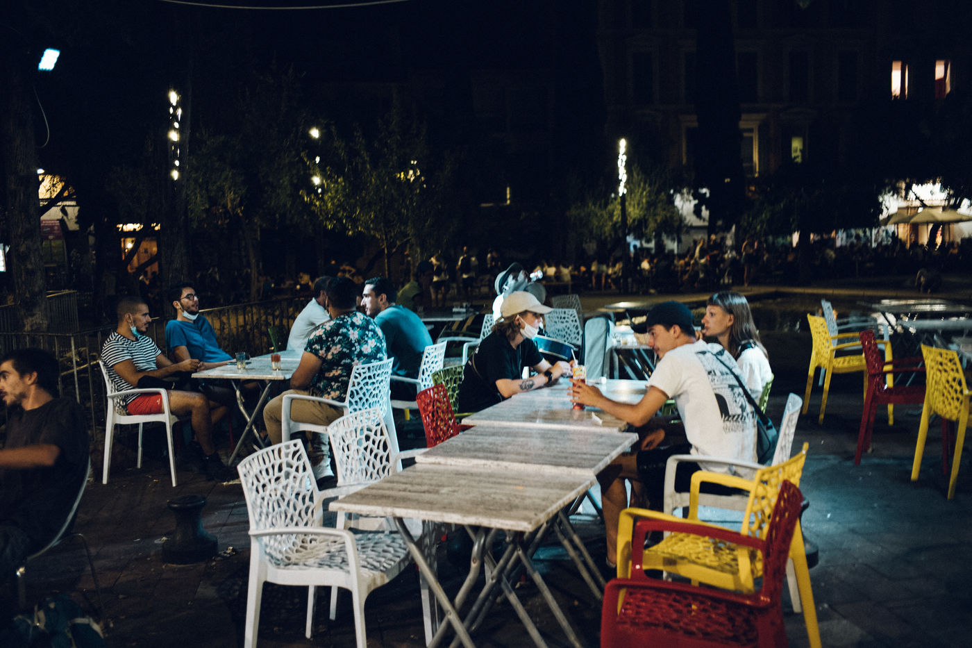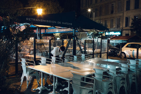 Suite à l'annonce du prefet les bars et restaurants doivent fermer leurs portes dès 23h. Inquiets ou résignés, les clients ont souvent quitté les terrasses dans le calme, et certains se sont installés à même le sol, tout à côté. Illustration sur le Cours Julien haut lieu des restaurants et bar à Marseille. Reportage réalisé pour Le Monde.