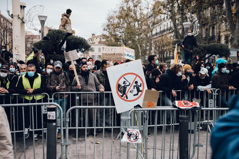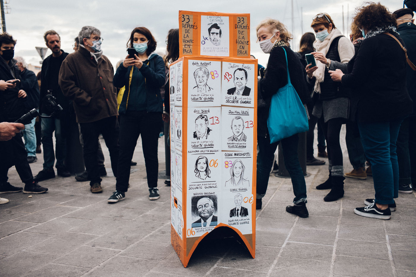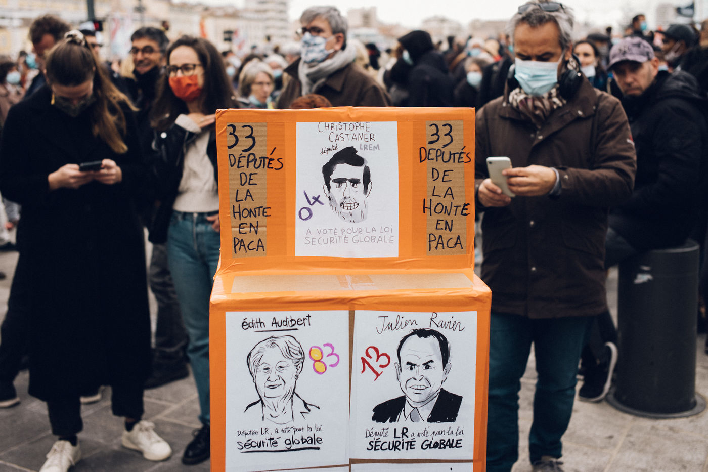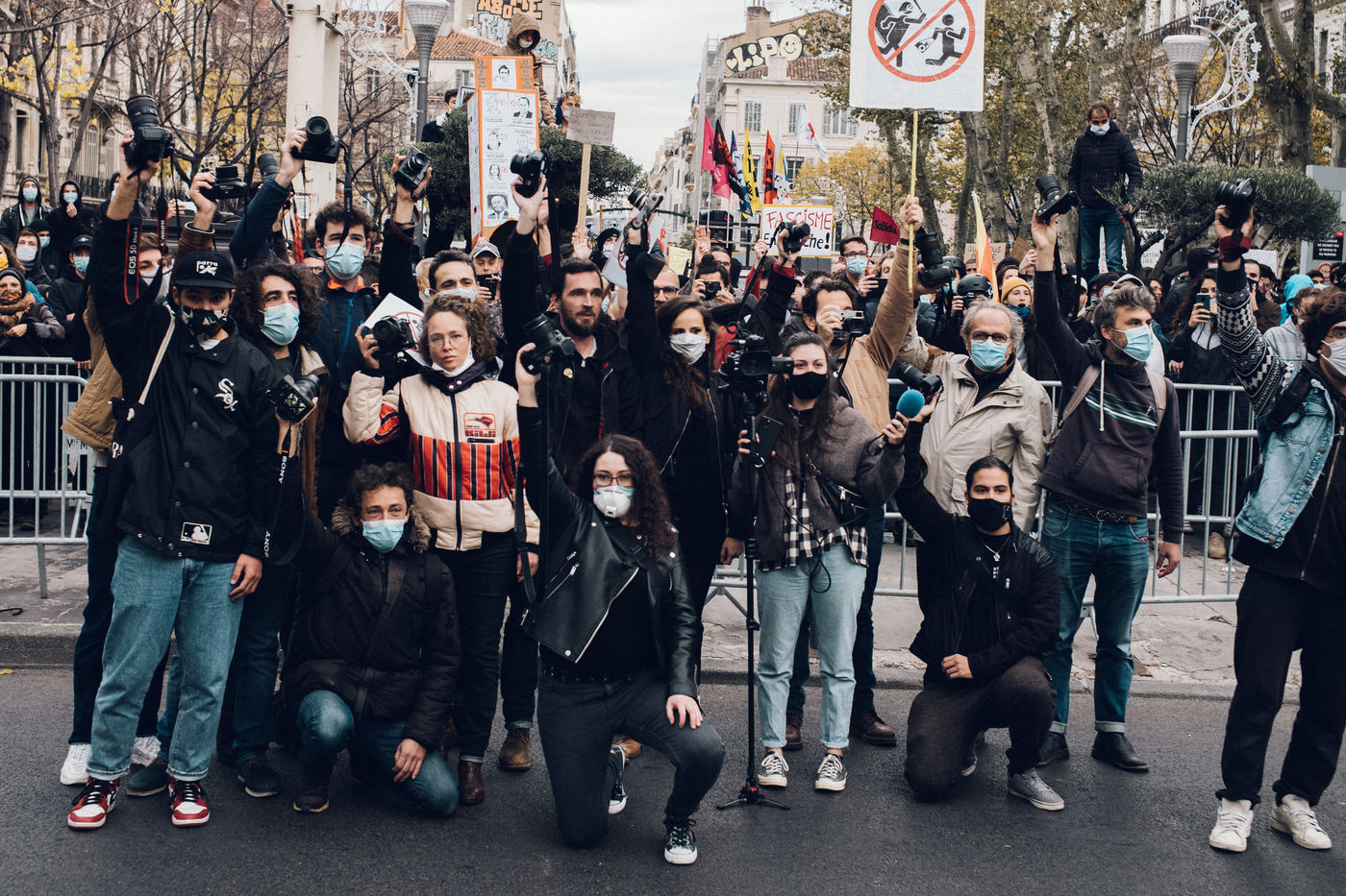 28 November 2020, Marseille, France. Gathering in Marseille for the March of Liberties, citizens and journalists to protest against police violence and the Global Security Law.