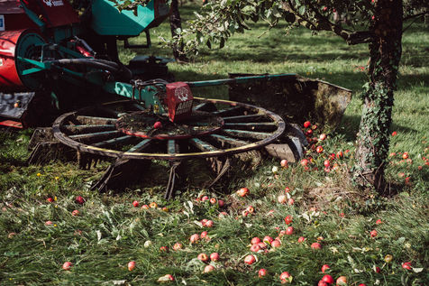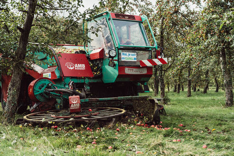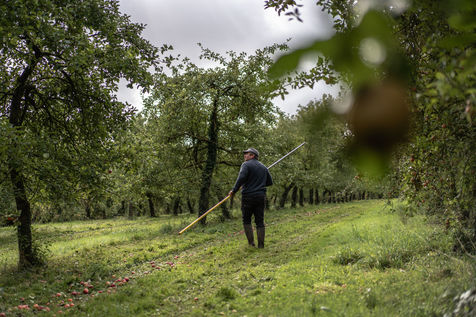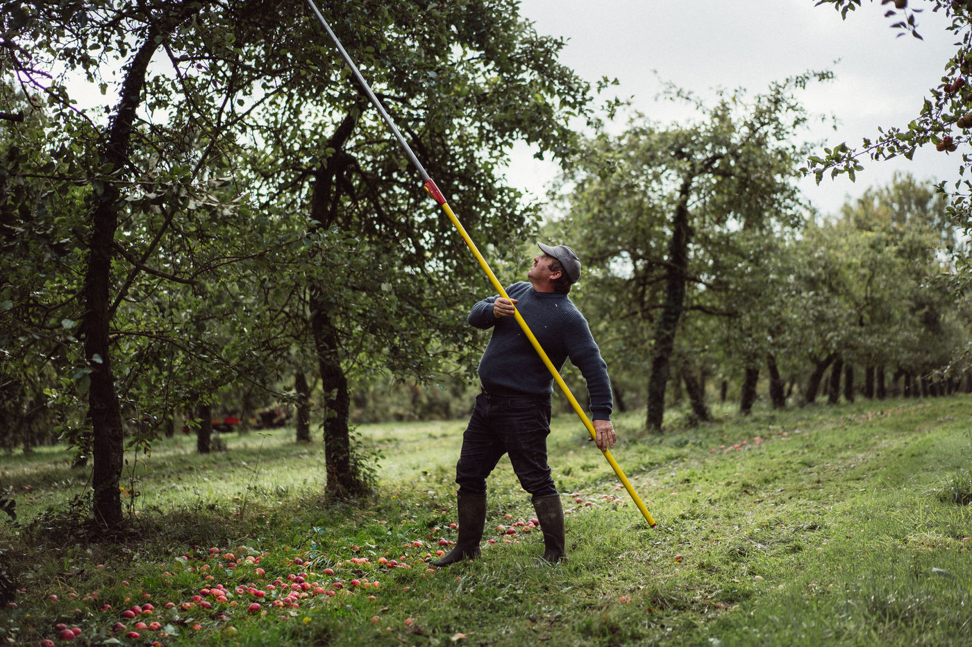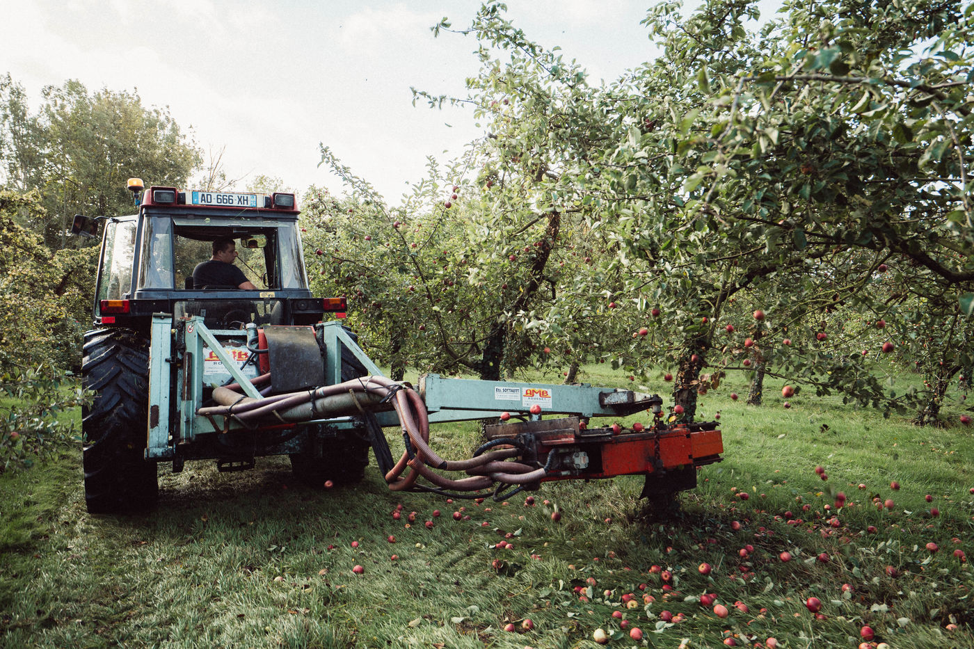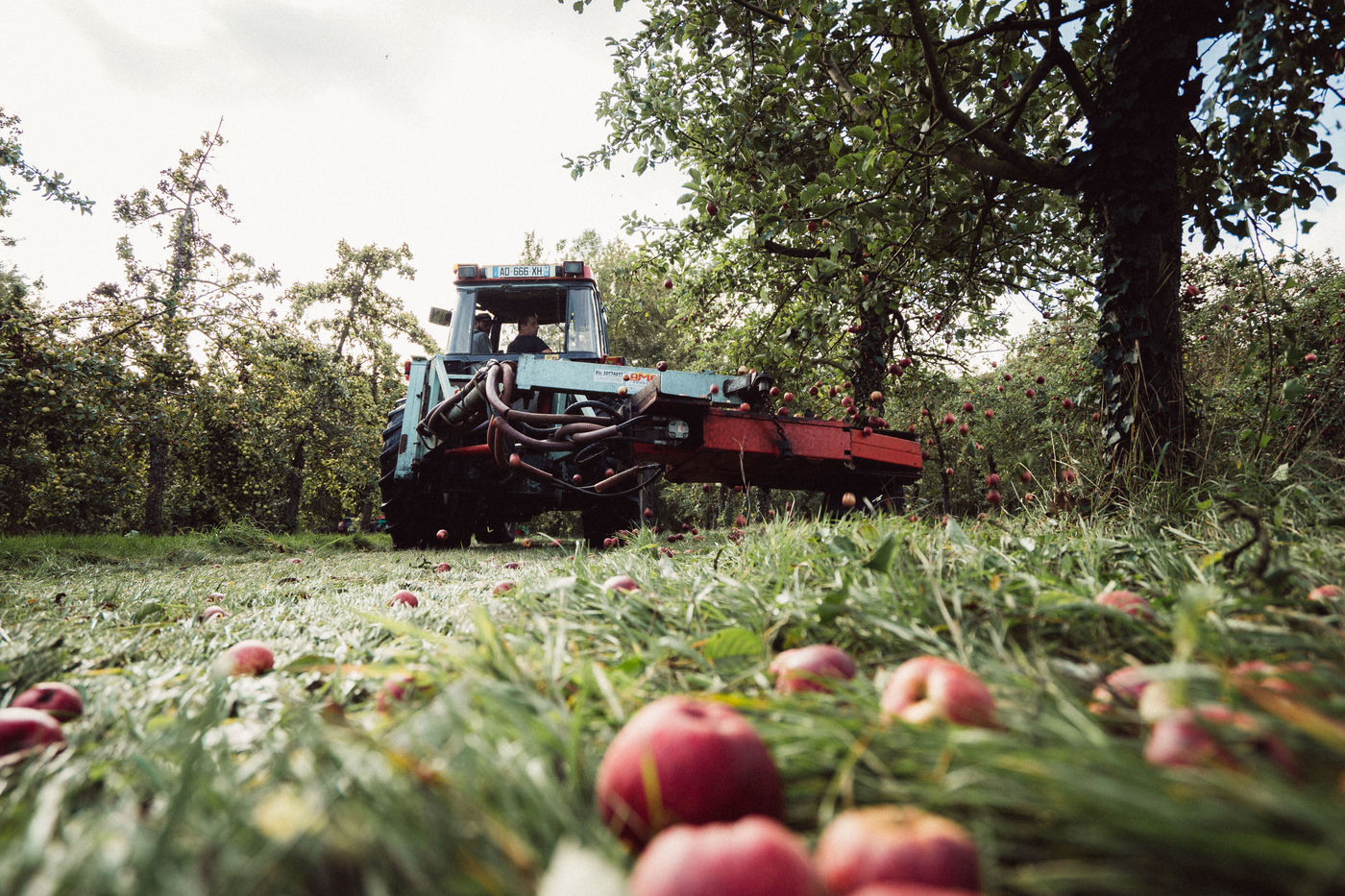 Dans le pays d'Auge en Normandie, la cidrerie Dupont s'adonnne a la recolte des pommes dans les vergés destinees ensuite à la production de cidre et de calvados.