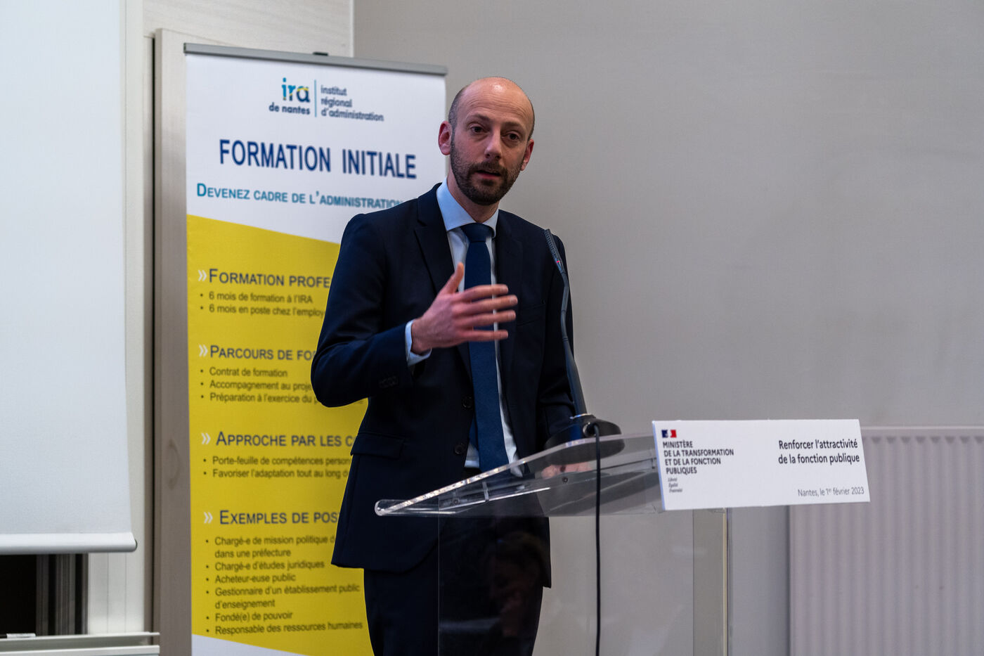 France, Nantes, le 1er février 2023. Stanislas GUERINI en visite a l'IRA de Nantes à l'occasion de ses 50 ans. Suivis de l'inauguration du logo créé à l'occasion du cinquantième anniversaire de l'institut régional d'administration de Nantes, ainsi que de plusieurs moments d'échange avec les professionnels du secteur de la fonction publique.