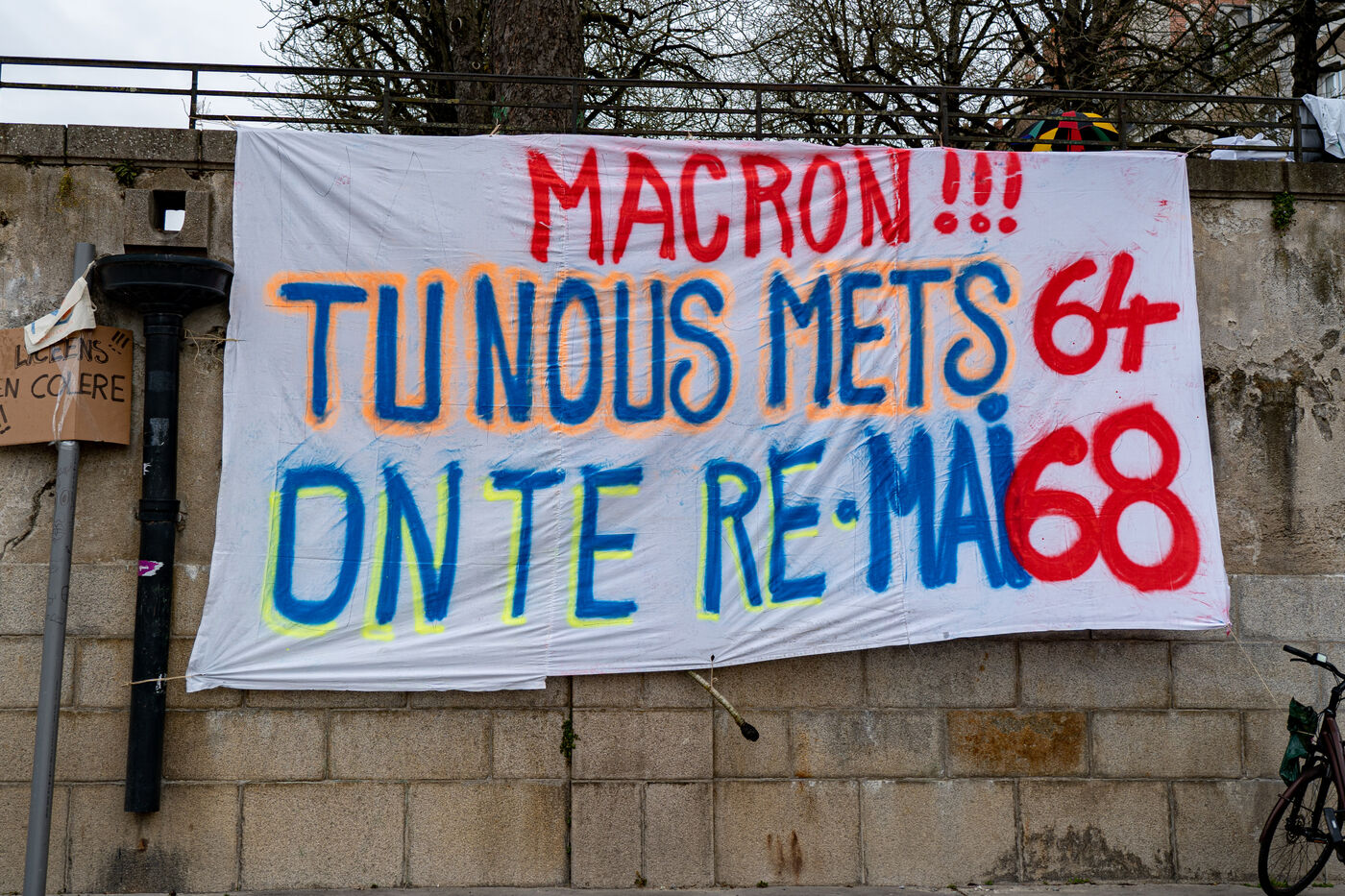 France, Nantes, March 7, 2023. Black day in Nantes where the number of demonstrators beats records as everywhere in France. About 75,000 people - union sources- took to the streets to demand social justice and the withdrawal of the new pension reform as well as the government of E.Macron. The leading motorcade, composed mainly of young people and more radical groups including the famous "black blocks", has tried several times to separate from the rest of the demonstration by entering the adjacent streets but is repelled by the police forces using profuse tear gas. Finally, the entire procession will not reach the arrival point of the demonstration because of the clashes taking place between police forces and demonstrators on the island of Nantes. Thomas Lukes / Hans Lucas