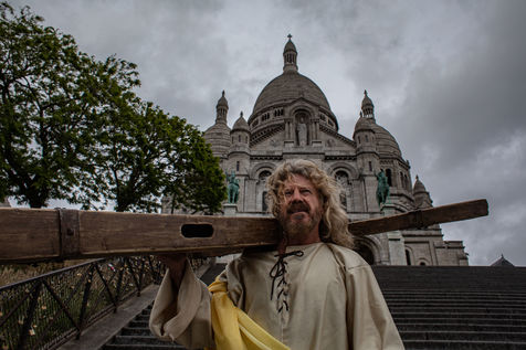 Paris, le 29 avril 2020 . La France est placée dans une situation de confinement quasi total pour arrêter la propagation de l'épidémie de Covid-19. Près du Sacré-C?ur, un homme vêtu du Christ porte sa croix. Il se fait appeler "Gilet jaune de Jésus" et veut continuer à maintenir le mouvement en vie pendant le confinement