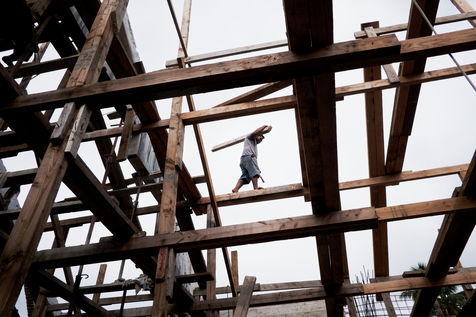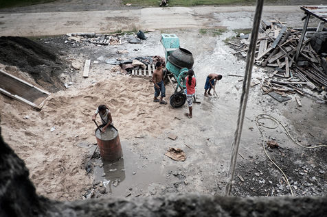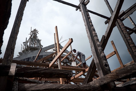 Elle nous mène d'abord à travers des chantiers d'un autre âge, où l'on travaille encore à la gloire de Dieu, pieds nus et sans aucune protection, souvent à des hauteurs vertigineuses.