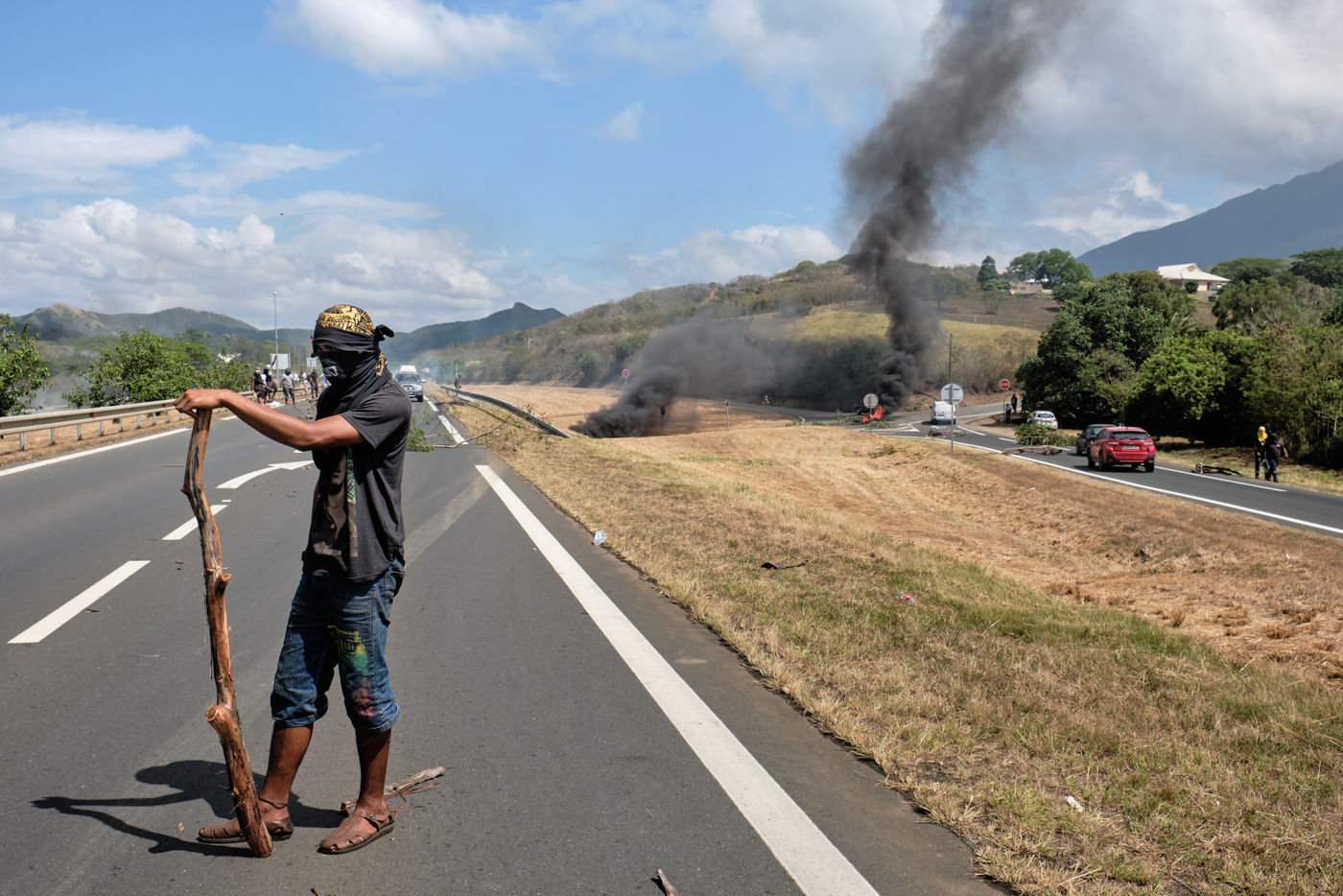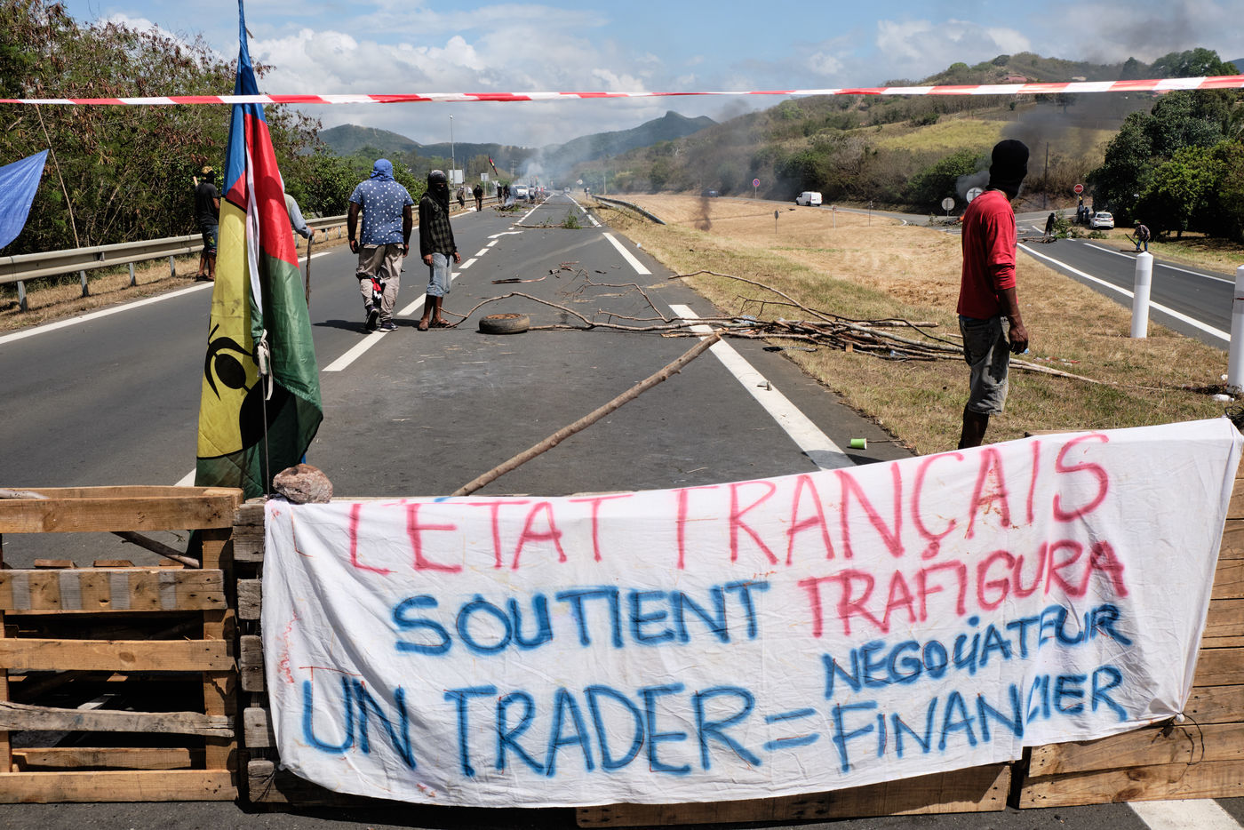 Paita, Tuesday, December 8, 2020. Opponents to the sale project of the Vale NC plant held a filtering dam on the main road leading to the agglomeration of Noumea. Reunited under the slogan "let's defend our resources", the "Usine du Sud - Usine Pays" collective opposes for many weeks to the possible sale of the Vale nickel plant, backed by the rich Goro deposit, to a Caledonian and international consortium led by the swiss trader Trafigura. Opponents are asking for stronger representations of Caledonian institutions in the shareholding as well as environmental guarantees. Photograph by Theo Rouby / Hans Lucas