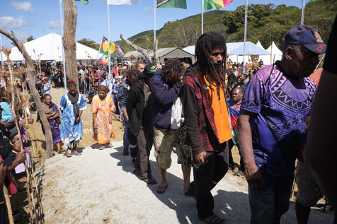 New Caledonia, La Foa, Wednesday September 1, 2021. Burial ceremony of the kanak great chief Atai and his Dao (?sorcerer?) Meche on the Wereha site. They had been killed in action against french colonial authorities on September 1, 1878. The skull of Atai, leader of the kanak insurrection of 1878, and that of his Dao ("sorcerer"), were returned by the French State in 2014, after long years of expectation from his descendants.