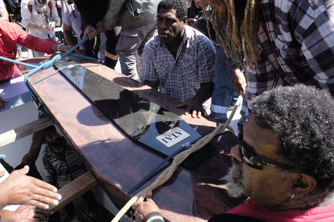 Nouvelle Caledonie, La Foa,mercredi 1er septembre 2021. Inhumation du grand chef Kanak Atai et de son Dao (« sorcier ») Meche sur le site de Wereha. Ils avaient été tués au combat contre les autorités coloniales françaises le 1er septembre 1878. Le crane d'Atai, leader de l'insurrection Kanak de 1878, et celui de son Dao (« sorcier »), avaient été rendus par l'Etat Français en 2014, après de longues années d'attente pour ses descendants.