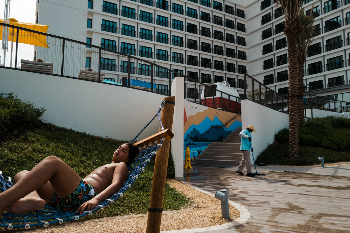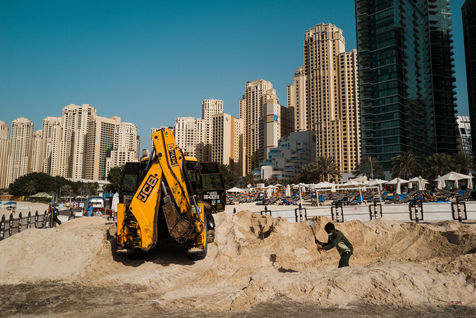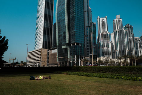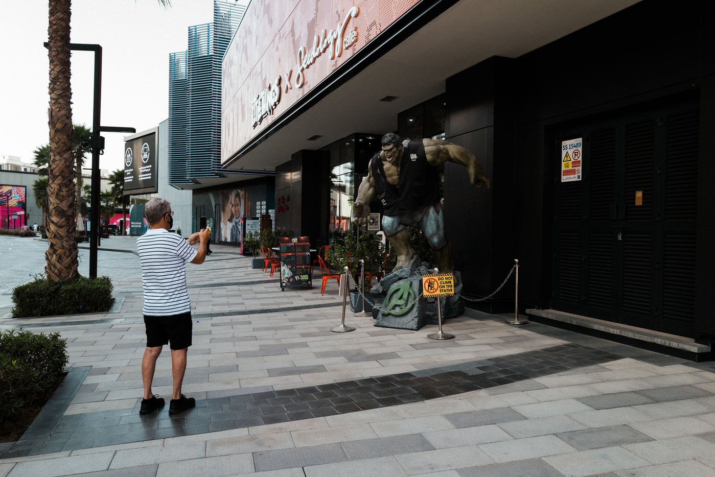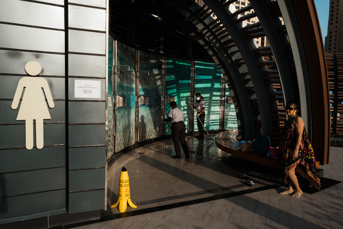 Si quelques privilégiés font le voyage, les complexes touristiques restent toutefois majoritairement déserts. Les journées sont rythmées aux sons de ses innombrables chantiers. Et Dubaï devient un grand parc d'attraction vidé de ses acteurs. Seuls une armée de gardes de sécurité et de personnels de nettoyage se tuent à la tâche pour garder propre une ville sillonnée par les livreurs Deliveroo.