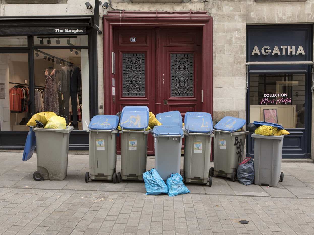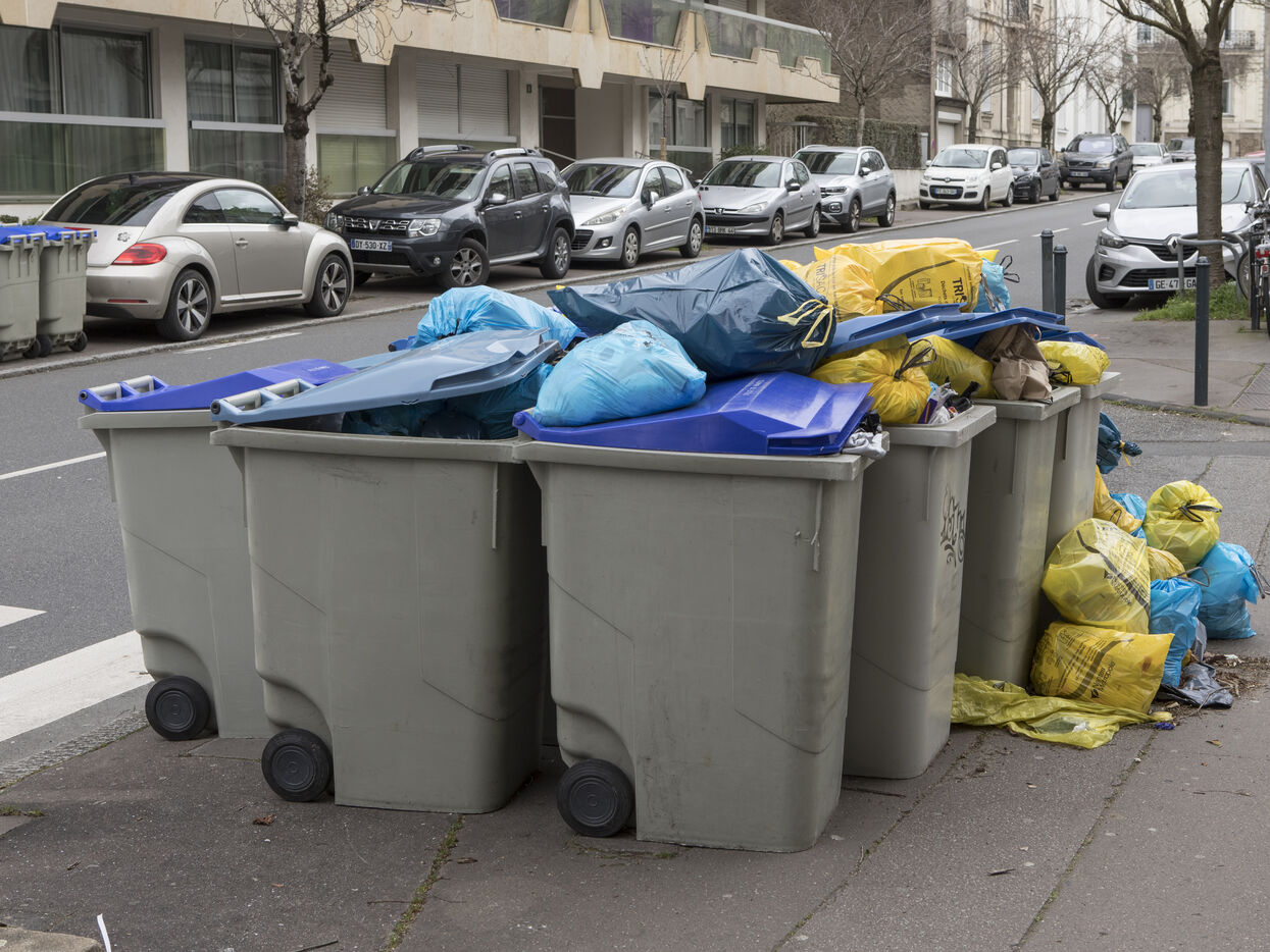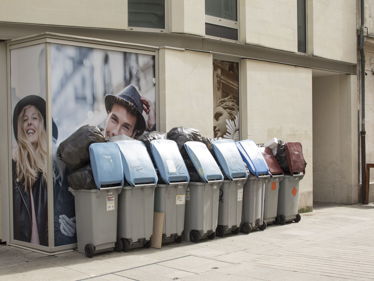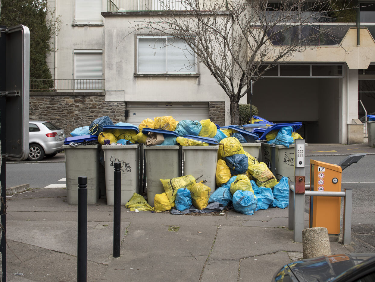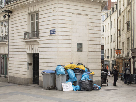 Nantes, Wednesday, March 15, 2023, city center. After about a week of strike of the garbage collectors of the Nantes metropolis within the framework of the mobilization on the reform of the pensions, the city center of Nantes takes part of blue and yellow.