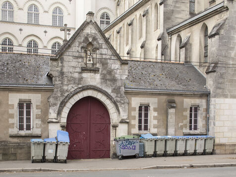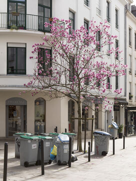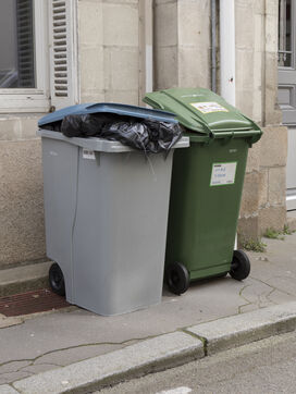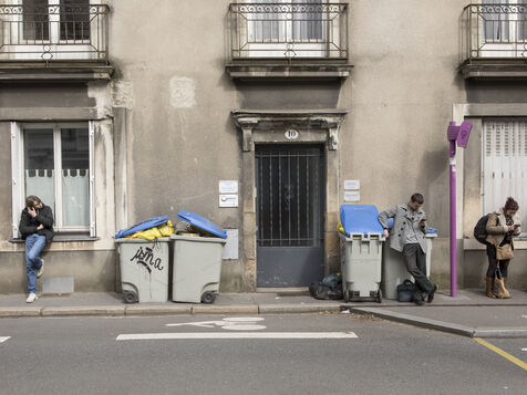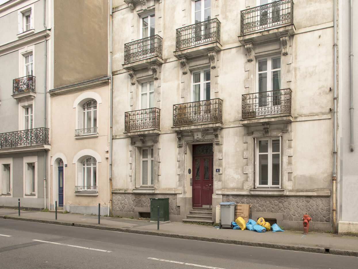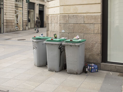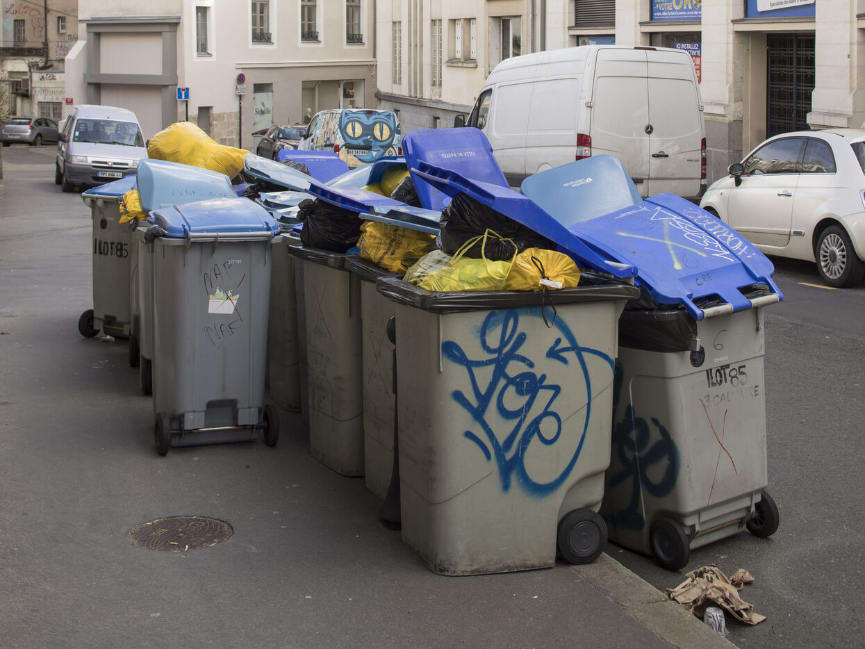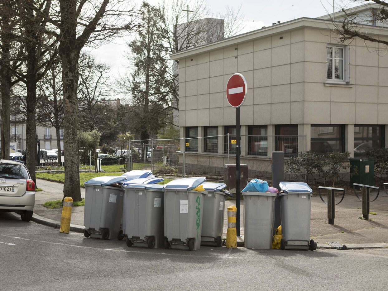 Nantes, Wednesday, March 15, 2023, city center. After about a week of strike of the garbage collectors of the Nantes metropolis within the framework of the mobilization on the reform of the pensions, the city center of Nantes takes part of blue and yellow.