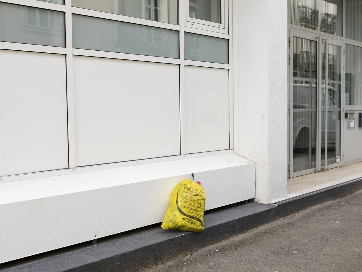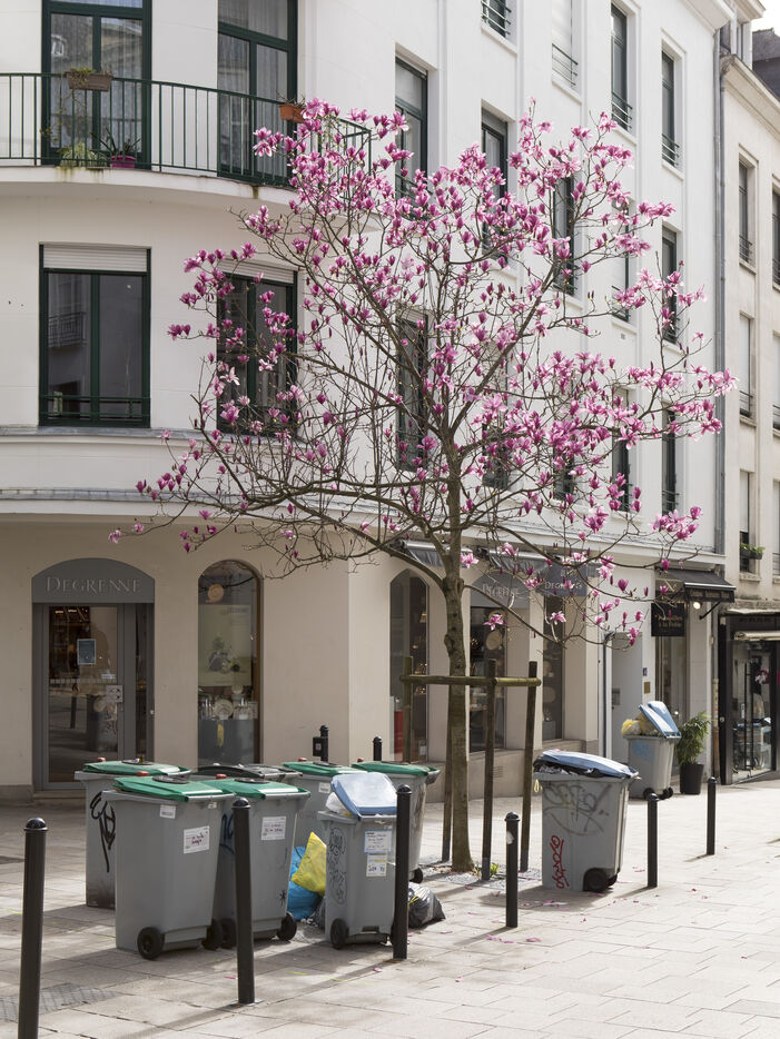 Nantes, le mercredi 15 mars 2023, centre ville. Après environ une semaine de grève des éboueurs de la métropole de Nantes dans le cadre de la mobilisation sur la réforme des retraites, le centre ville de Nantes se part de bleu et de jaune.