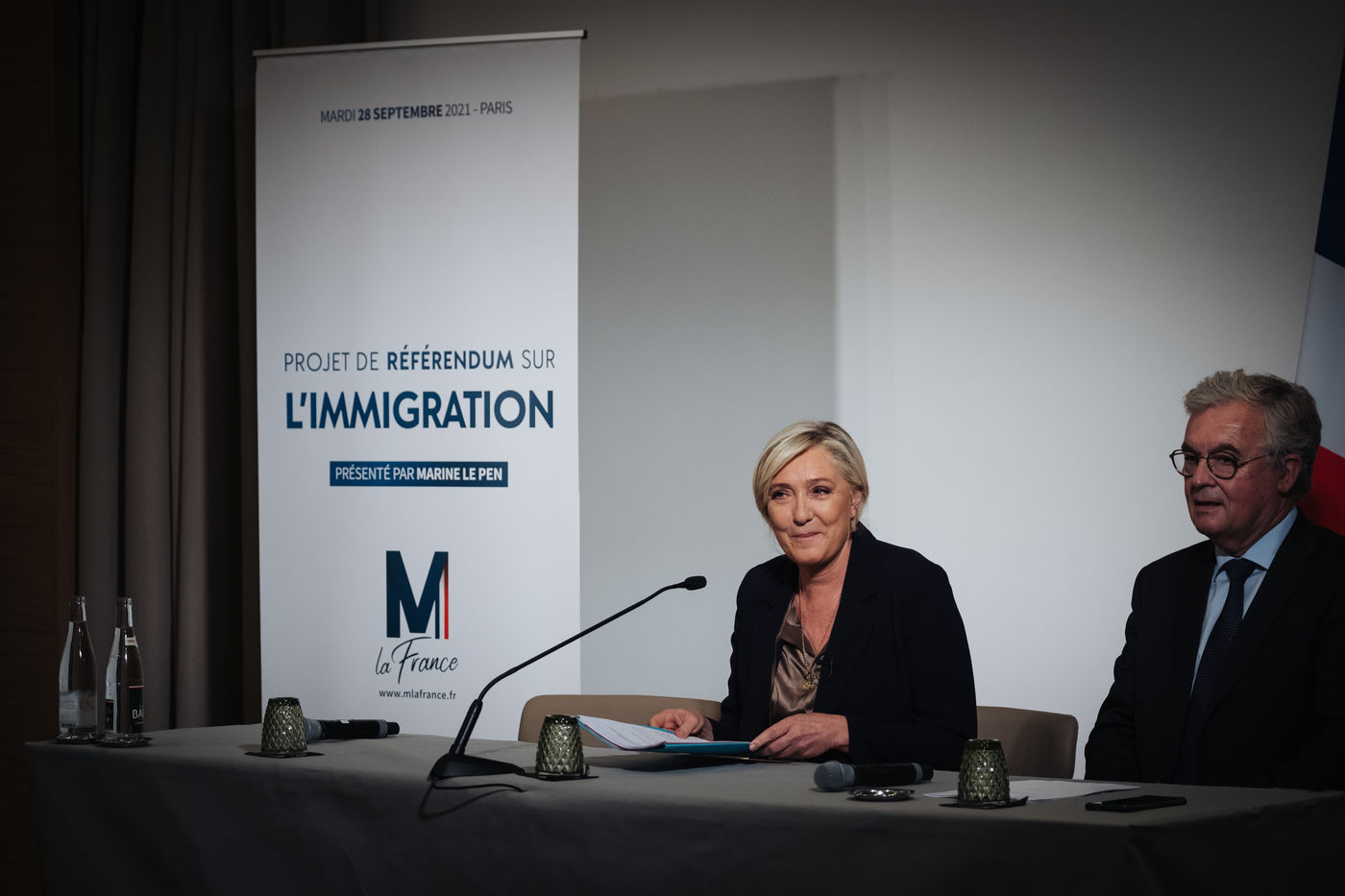 Press conference of Marine Le Pen, September 28, 2021 in the 8th district of Paris. The candidate of the National Rally for the presidential election 2022 presented her project of referendum on immigration included in her program.