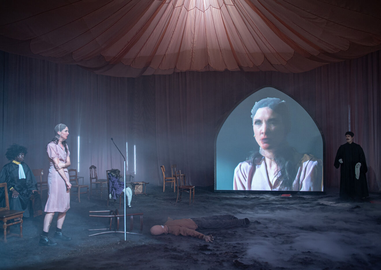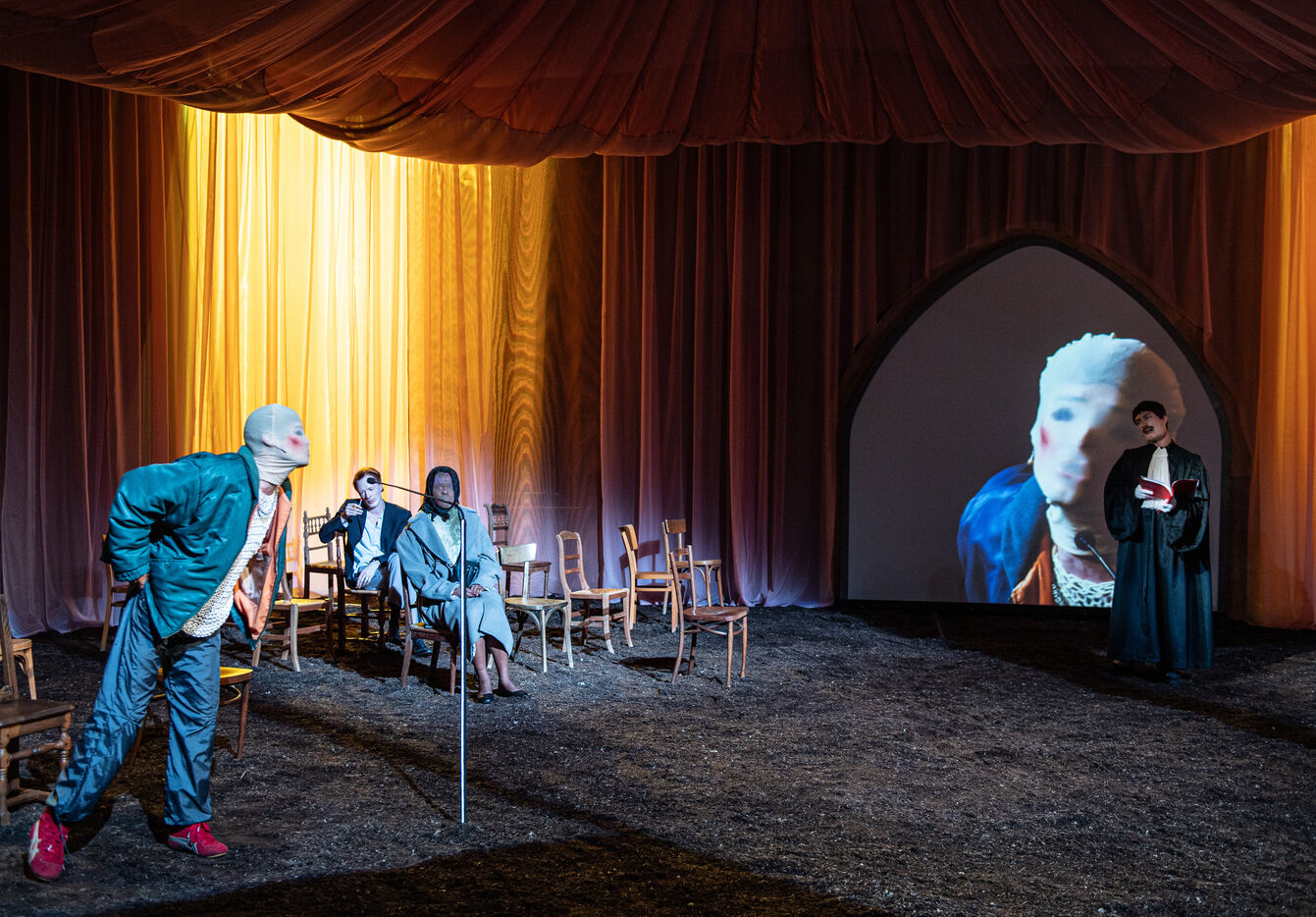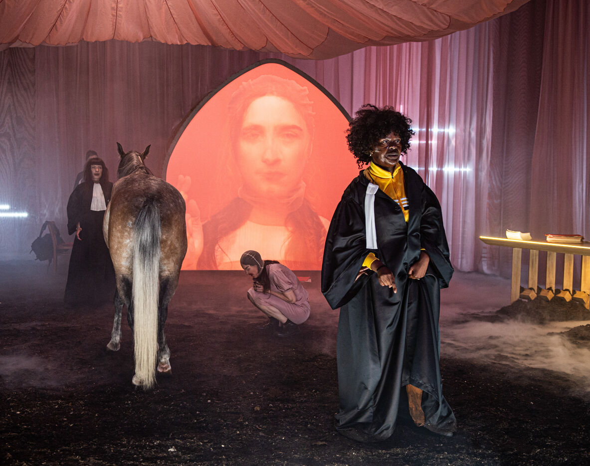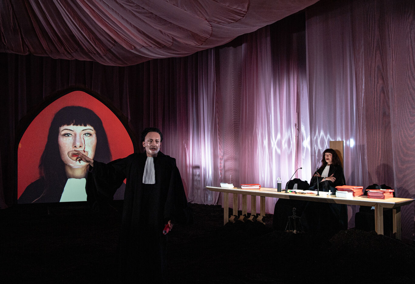 Created after a long immersion in the heart of the penal system, and particularly immediate appearance trials, Léviathan questions the fairness of institutional justice. Working with author Guillaume Poix, Lorraine de Sagazan draws inspiration from transformative justice and other alternatives to the traditional judge-punish-imprison model. Under a tent that serves as a makeshift courtroom, an echo to the installation presented at the Collection Lambert, Léviathan tries to understand—beyond good and evil—the ties between the legal system and the inequalities that govern our society, overturning certain obvious truths in the process. Through the biblical figure of the Leviathan, the show confronts us with violence and its regulation by law, asking this crucial question: who is the monster?