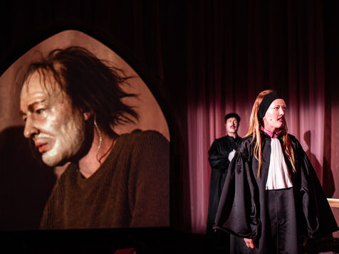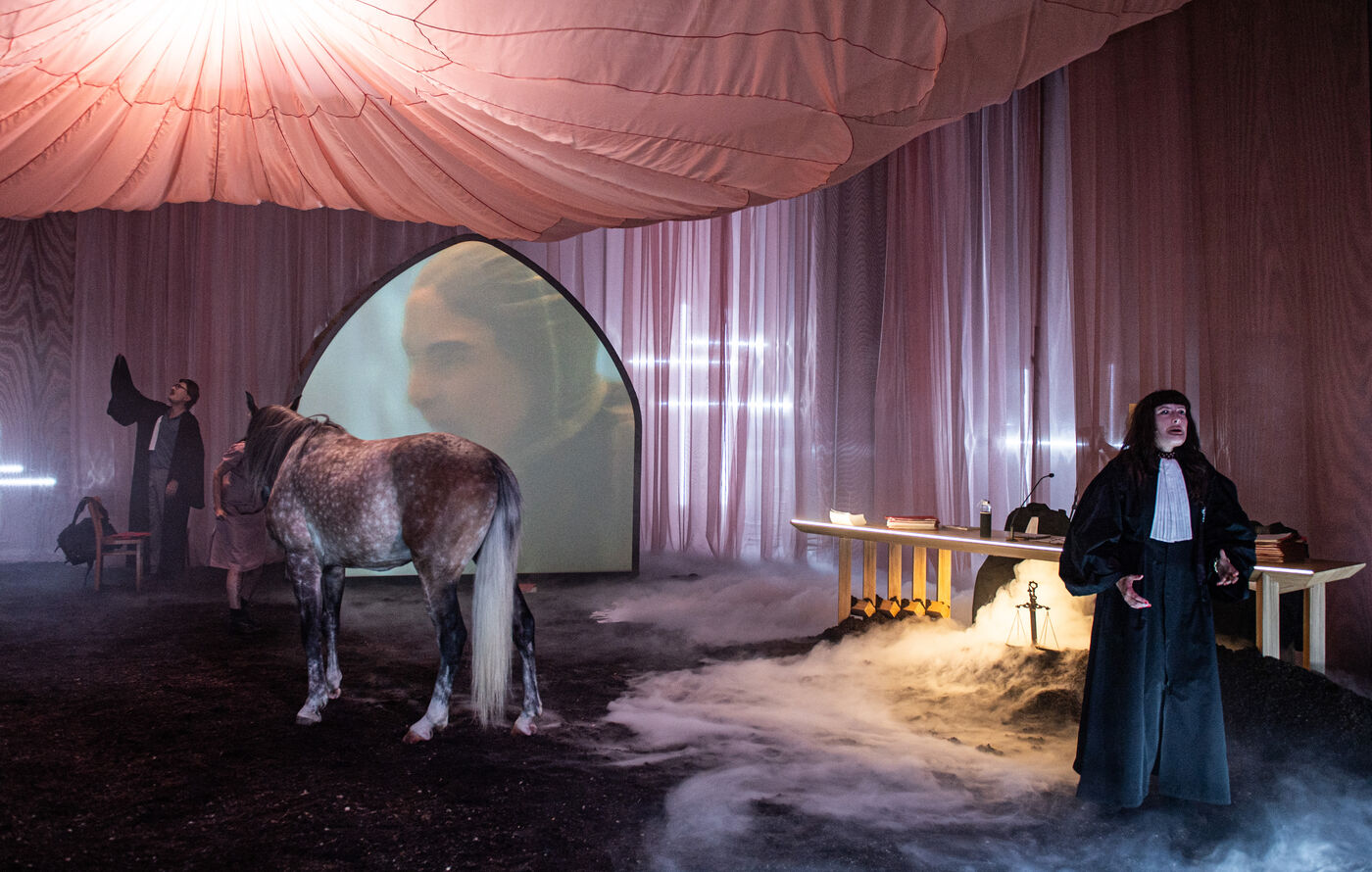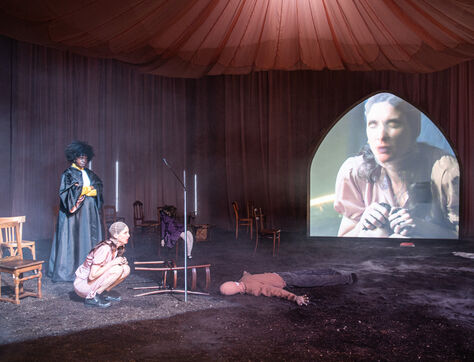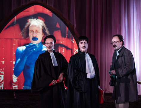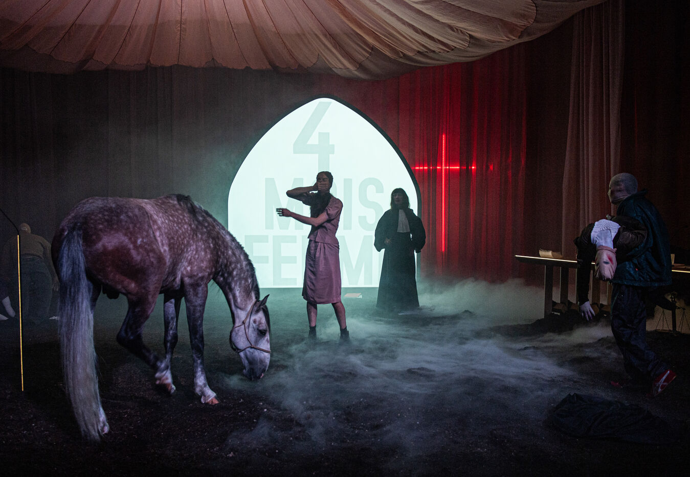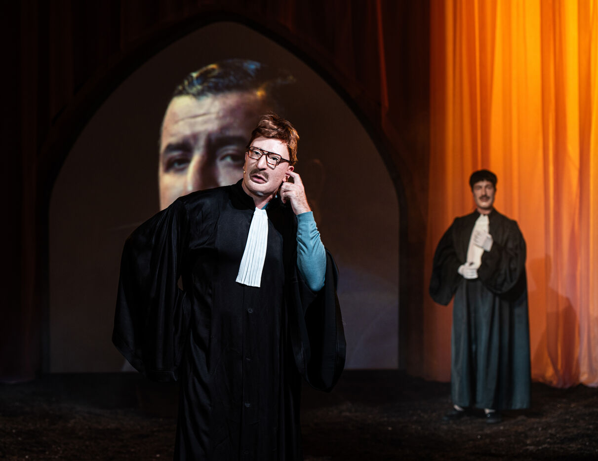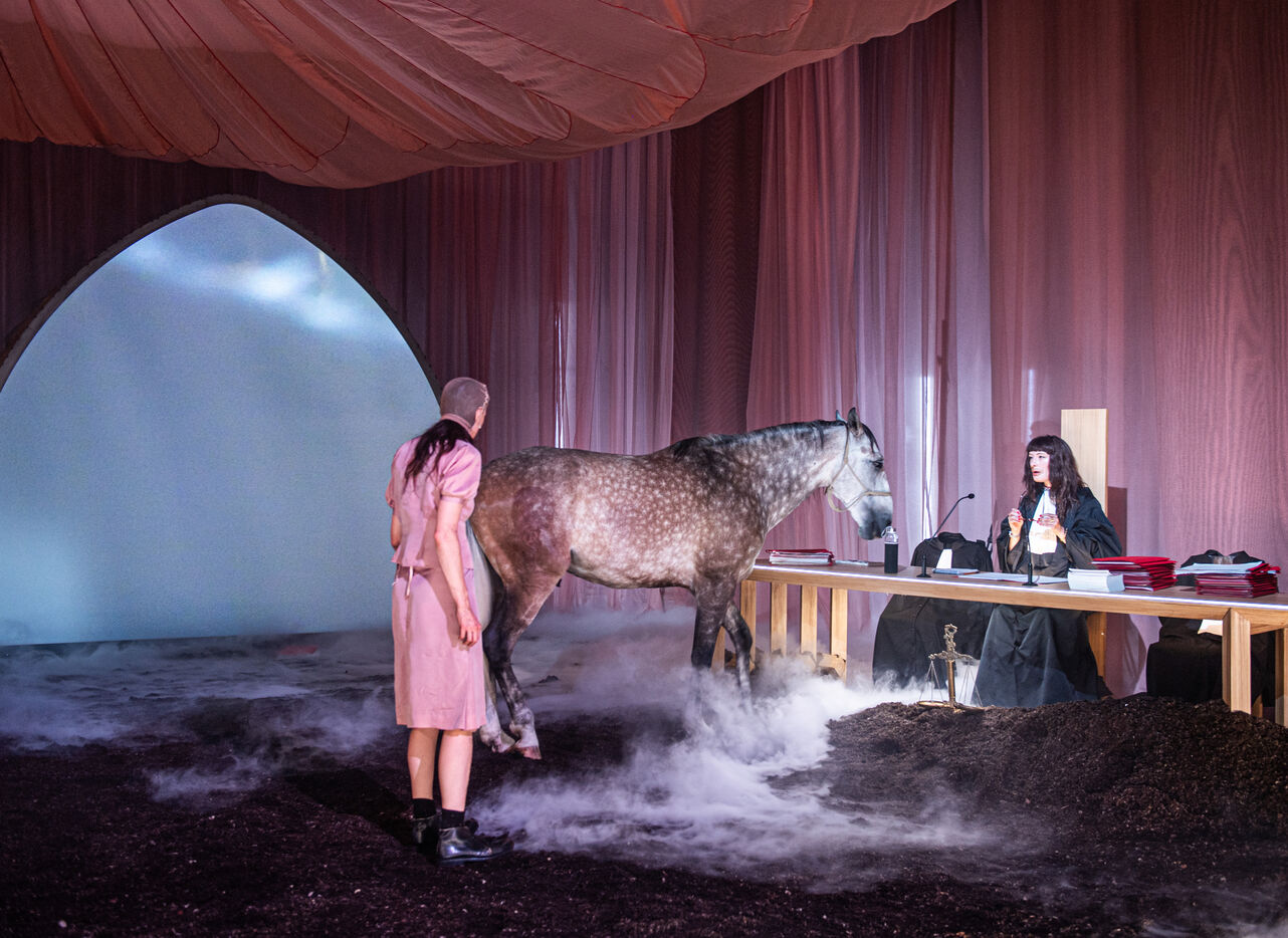 Created after a long immersion in the heart of the penal system, and particularly immediate appearance trials, Léviathan questions the fairness of institutional justice. Working with author Guillaume Poix, Lorraine de Sagazan draws inspiration from transformative justice and other alternatives to the traditional judge-punish-imprison model. Under a tent that serves as a makeshift courtroom, an echo to the installation presented at the Collection Lambert, Léviathan tries to understand—beyond good and evil—the ties between the legal system and the inequalities that govern our society, overturning certain obvious truths in the process. Through the biblical figure of the Leviathan, the show confronts us with violence and its regulation by law, asking this crucial question: who is the monster?
