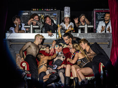 CABARET DÉCADENT, REVUE ÉLECTRIQUE N°777 VICE, an atmosphere of sulphur and sweat, nightclub hammam, fumes and black smoke, tongues loosen, speakeasy, bodies liquefy, dirty and saturated techno, a disco ball in the belly, catch your breath, vice is at your door. Power, lust, money, poisons of a damned era. Violence, fire, boiling metal, venom from the entrails of a dying and pockmarked society, overly made-up Marvel characters. Standing dance, kneeling screams, barking dogs, tap dancing on cans, central atomic podium, electro-vice, tacatacatacatac, politics blocked, poetic declamations. Vulgar circus and poor man's cabaret: the ball of the lost. Damned, deviants, monsters and glitter, messy party, voodoo mass, no mass, just wine, games, I am sensual, torrid, an electric ladyland, insolent electric freedom.