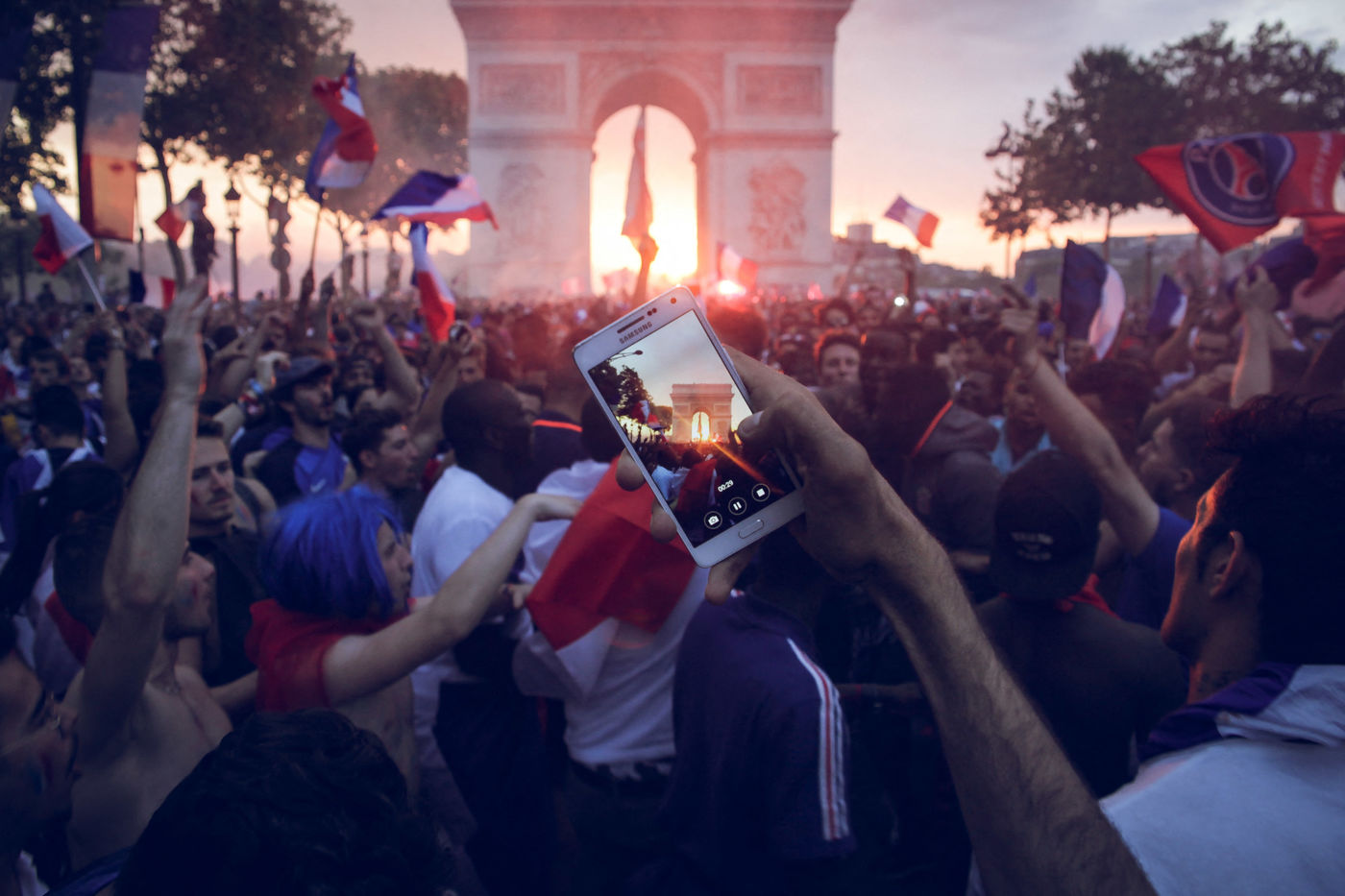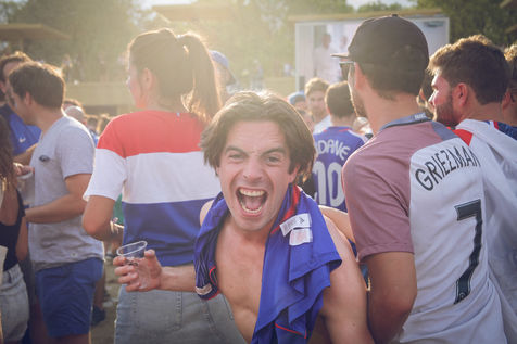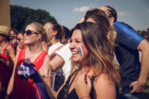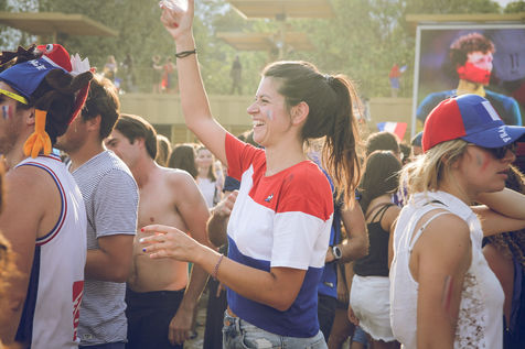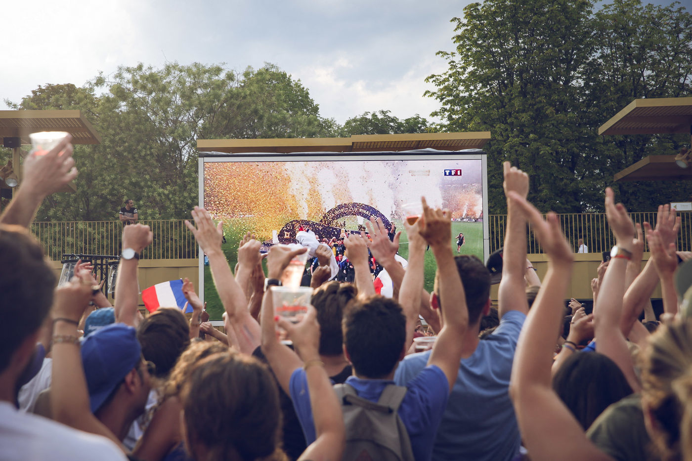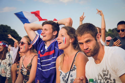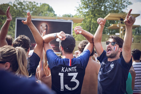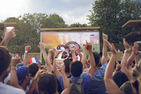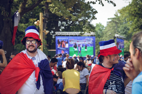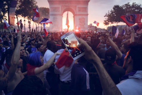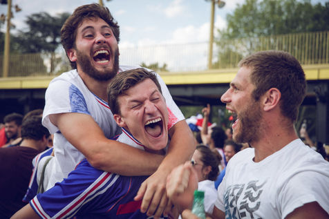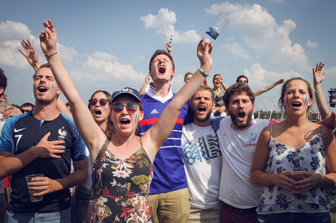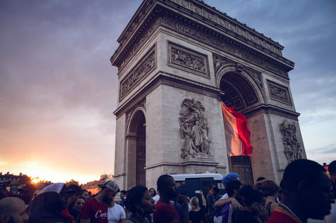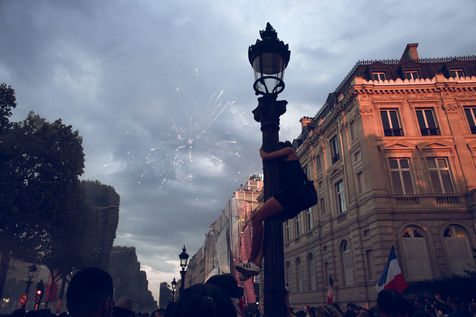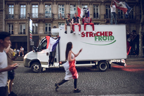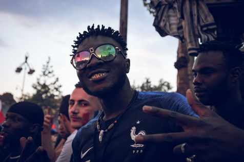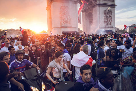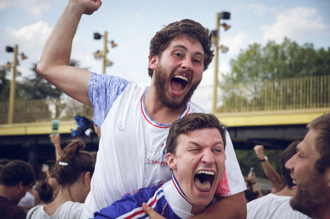 Paris, le 15 Juillet 2018. Des milliers de supporters sont rassemblés pour regarder la finale de la Coupe du Monde de football. La France remporte le trophée pour la deuxième fois de son histoire, ses supporters exultent. S'en suivent des scènes de liesses à Paris.