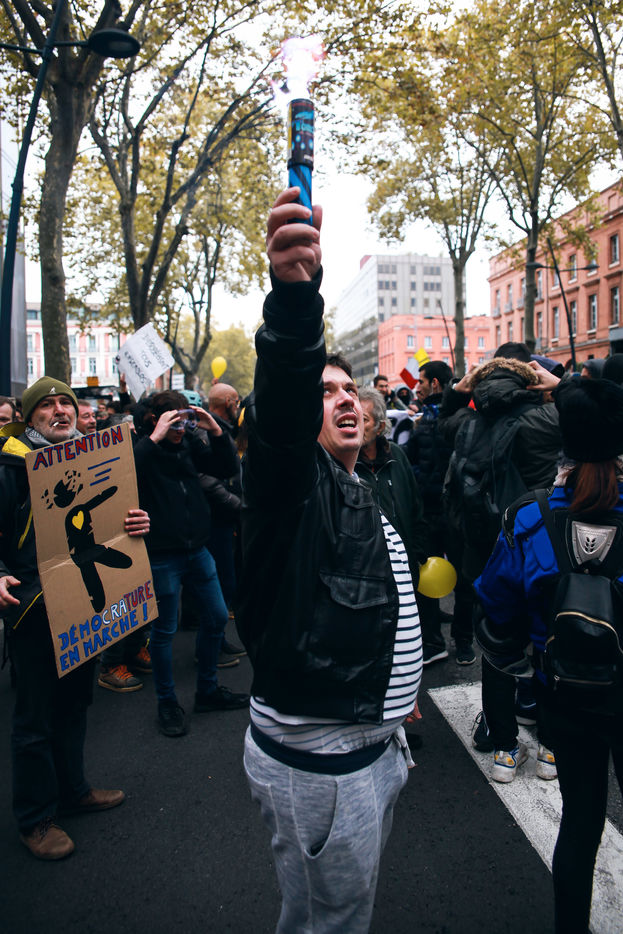Environ 2 000 personnes ont manifesté à Toulouse à l'occasion du premier anniversaire de la mobilisation des gilets jaunes. La manifestation a rapidement été stoppée par les forces de l'ordre. À Toulouse, le 16 novembre 2019.