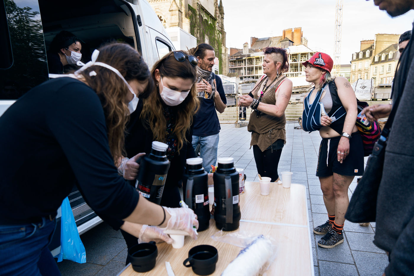 Depuis le début du confinement le 17 mars 2020, l'antenne rennaise de l'association Utopia 56 tourne dans la ville de Rennes trois fois par semaine pour apporter une aide alimentaire, des produits d'hygiène ainsi que de la compagnie à celles et ceux qui vivent dans la rue. Série réalisée le 16 avril 2020, à Rennes.