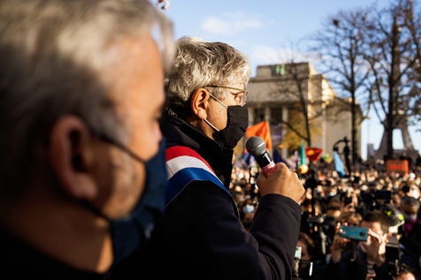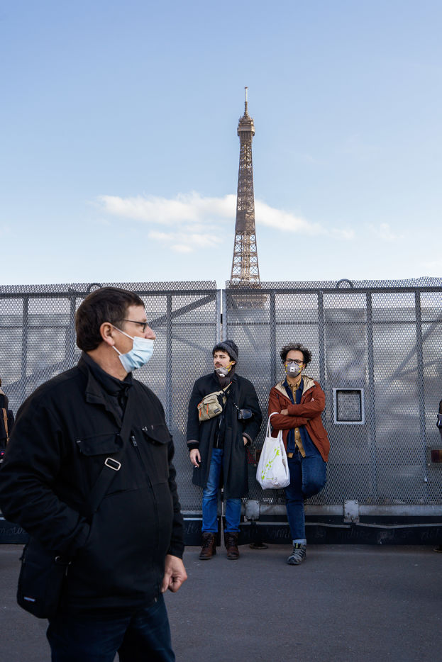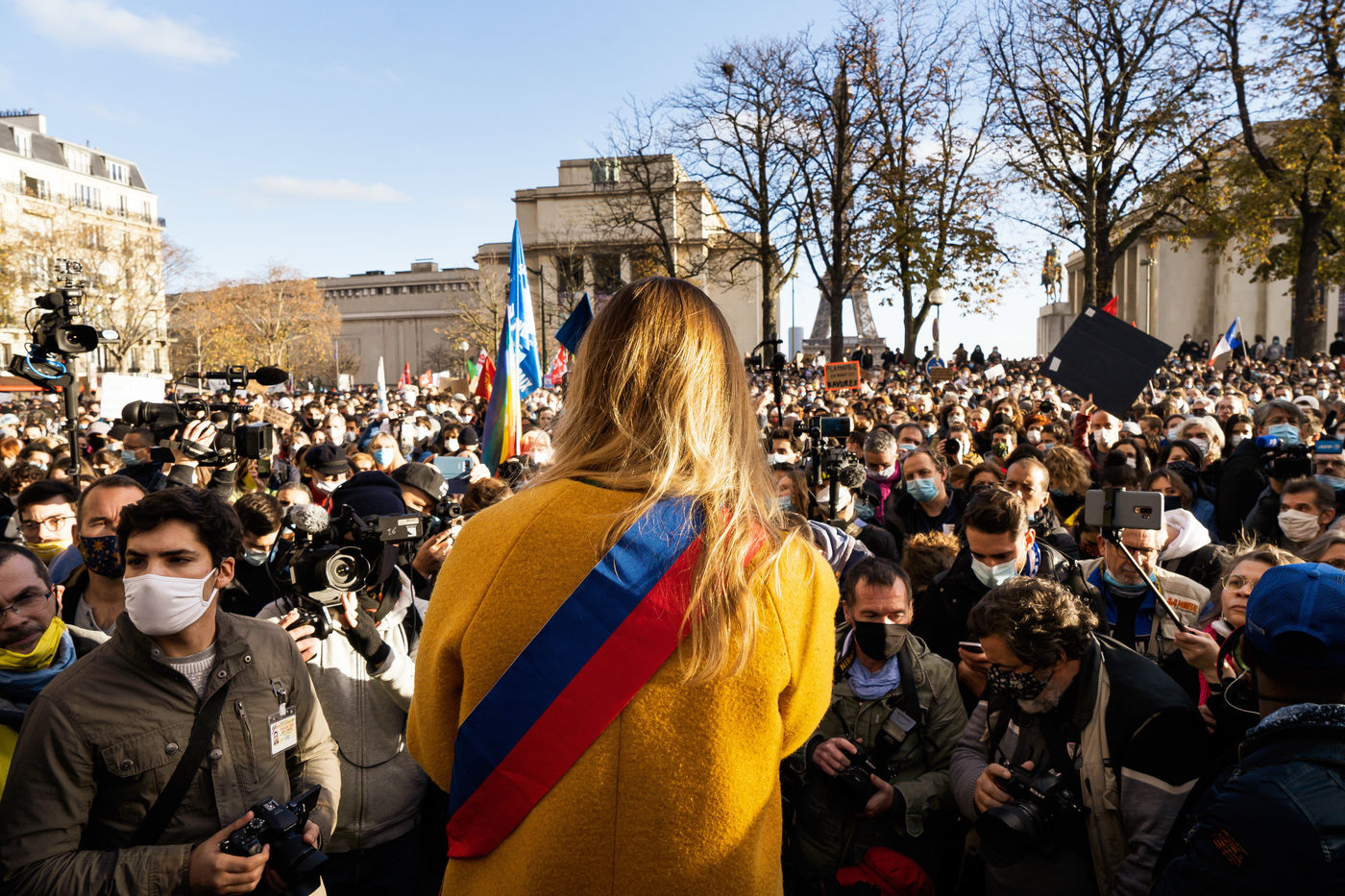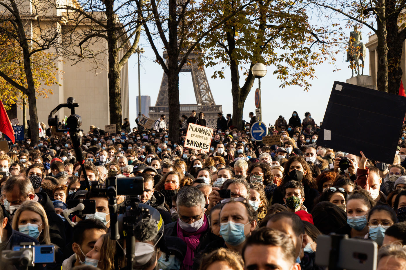 Plusieurs milliers de personnes ont manifesté sur le parvis des droits de l'homme au Trocadéro, à Paris, le samedi 21 novembre 2020 afin de protester contre le projet de loi dit "Sécurité globale".