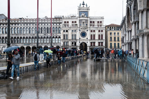 A Venise le 27 septembre 2020, sur la marée haute place saint pierre, l'eau monte. Une acqua alta sans graves conséquences mais qui rappel le danger auquel est soumis Venise. Les coefficients de marées de ce 27 septembre n'étaient pas particulièrement élevés, pourtant la place était innondée.