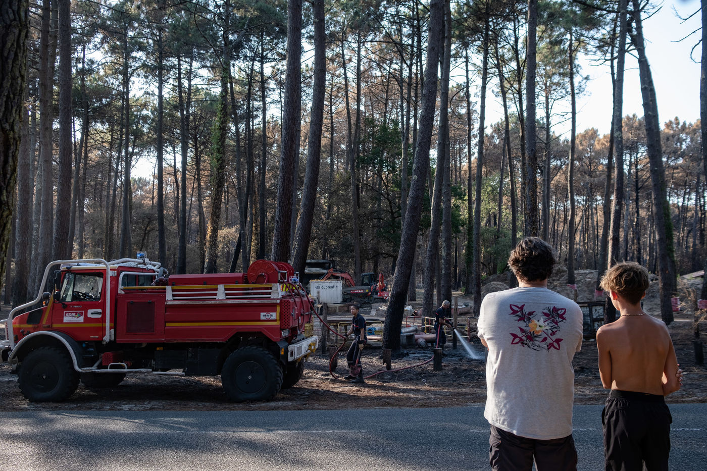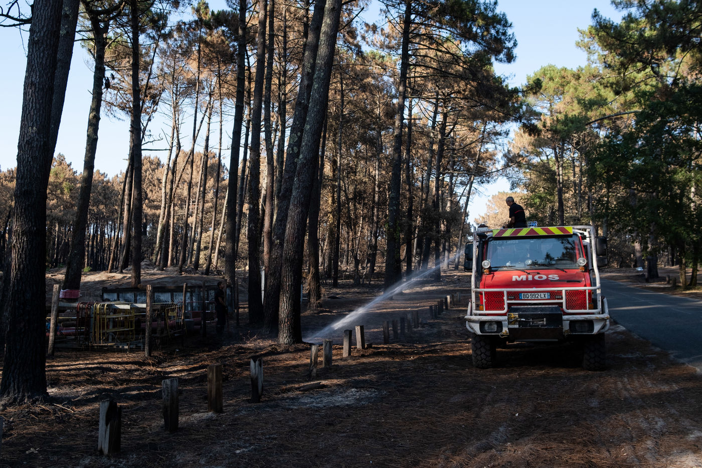 In Cazaux, in Gironde, on July 24, 2022, after the passage of the fire of La Teste de Buche. This one is now fixed and the inhabitants could return to their homes. The firemen are still working, because the fire is in suspense, in the ground. A restaurant, cars and some buildings were destroyed by the flames.