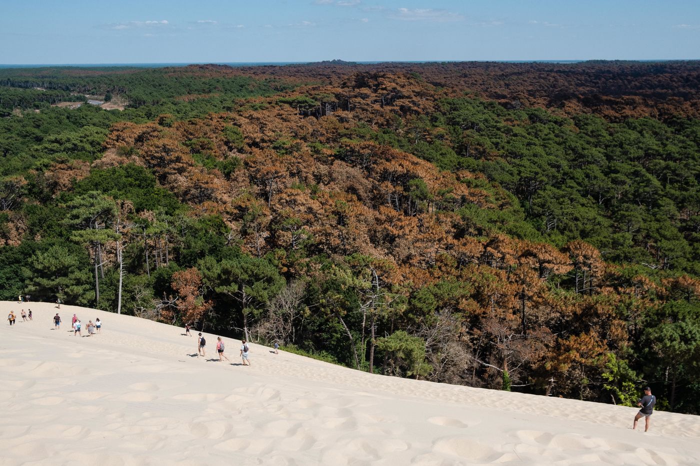Dune du pilat, Gironde, 27 Juillet 2022. Après le feu de La teste de buch qui a gravement affecté le massif forestier, la dune du pilat est de nouveau accessible par convois de bus.