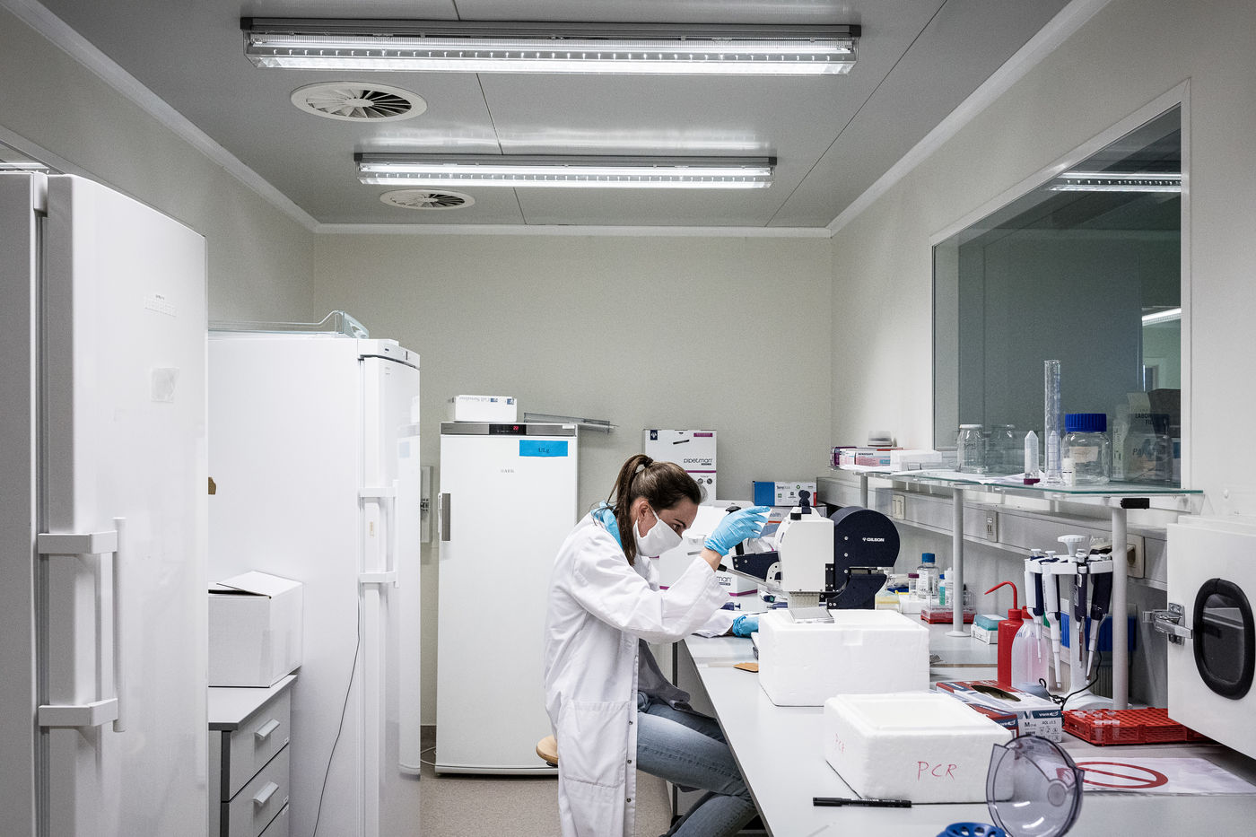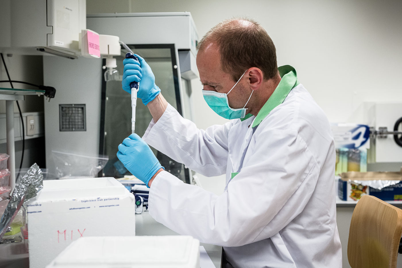 The final step is conversion and amplification. And for this, the University of Liège asked Professor Laurent Gillet to set up a series of laboratories in the veterinary faculty of the University of Liège, capable of producing more than 2000 tests per day. This part, although less risky in terms of handling, remains no less difficult. Here too, you have to be extremely concentrated in order not to make mistakes in the process. This is why the teams of four researchers work no more than four hours a day. On a voluntary basis once again.