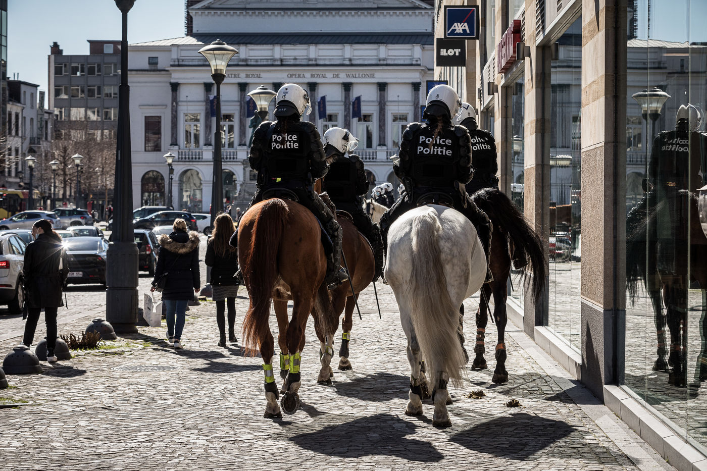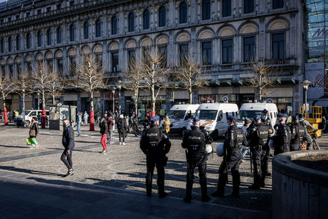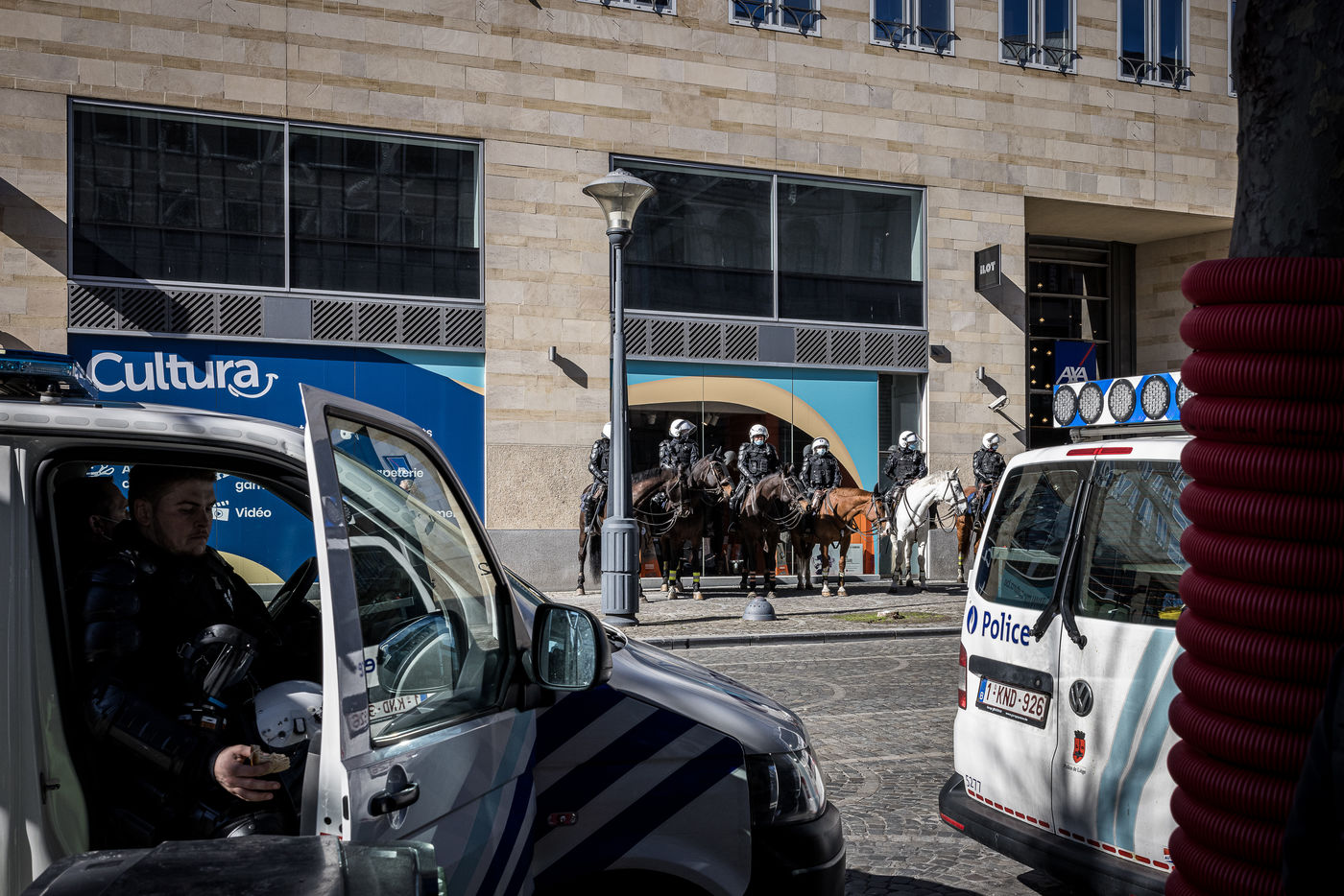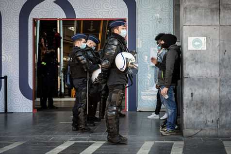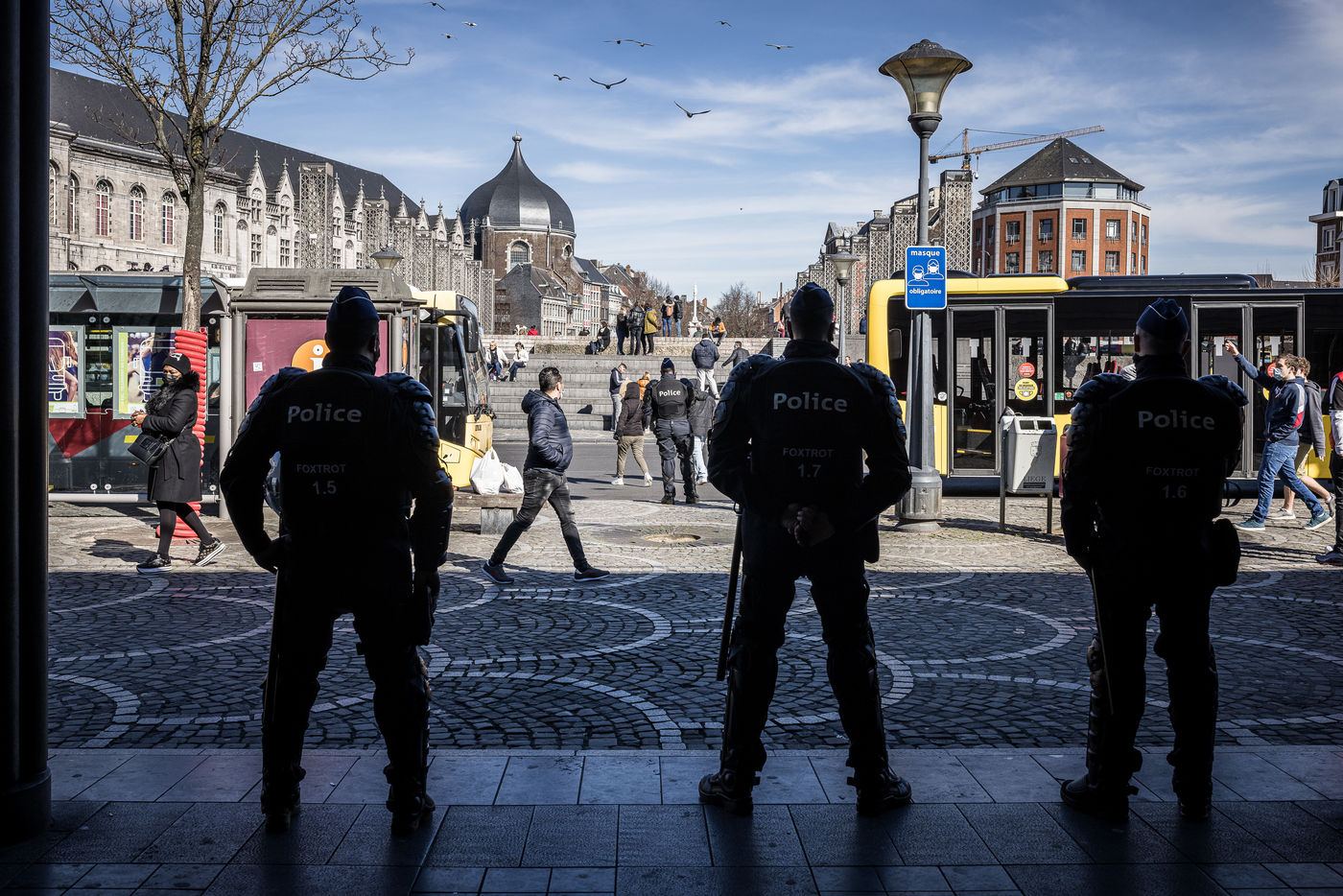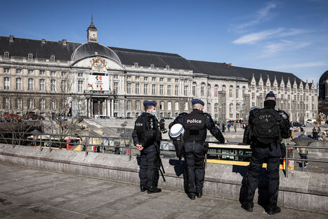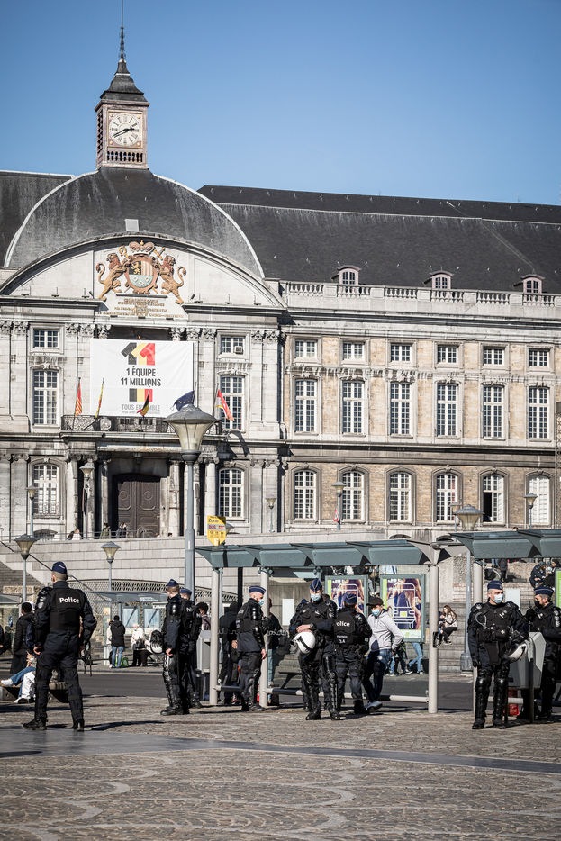 Liege, Belgium. March 20th, 2021. Following the violent riots of March 13 on the Place Saint-Lambert, the Police is deployed in large numbers in the city center of Liege in order to dissuade the rioters from trying to reproduce last week's scenario.