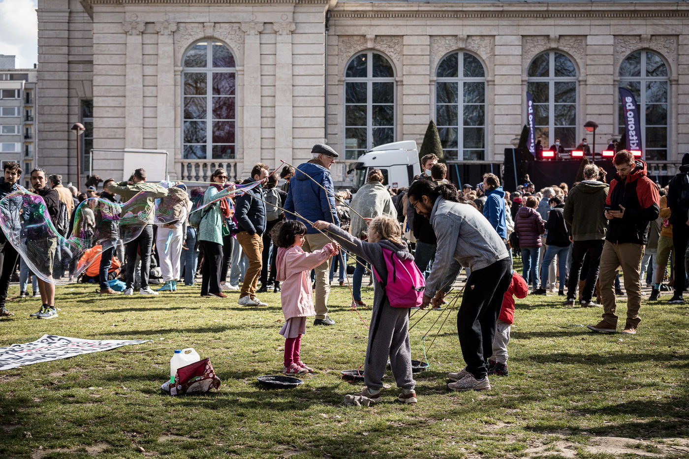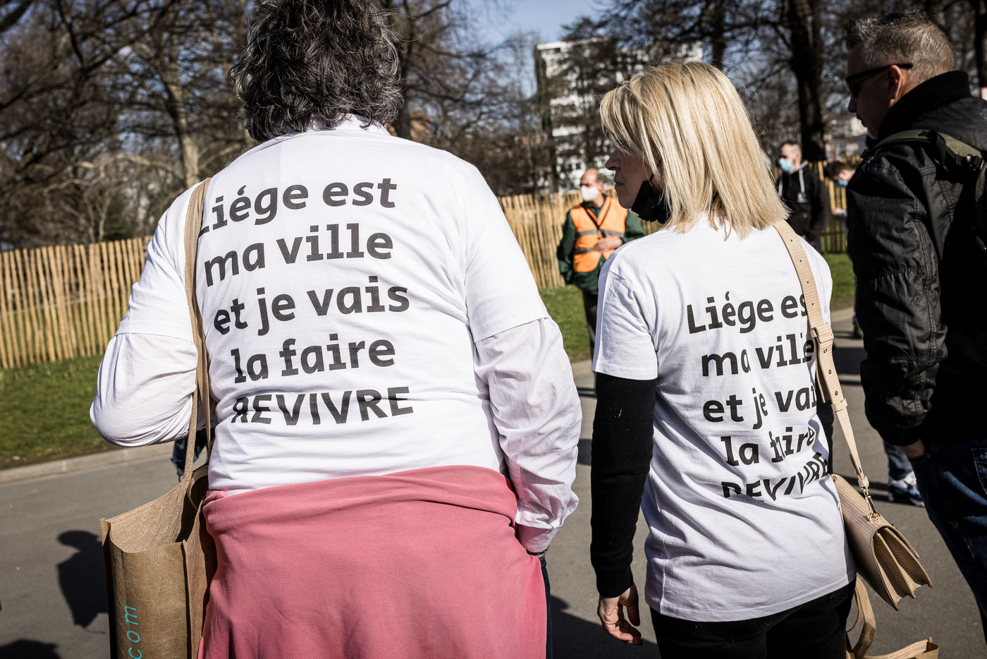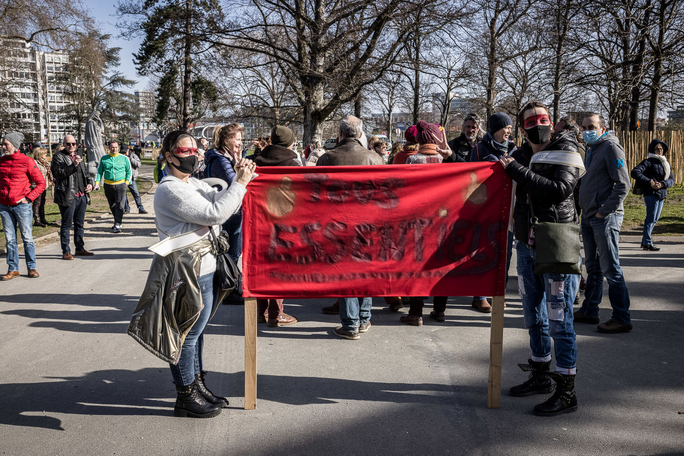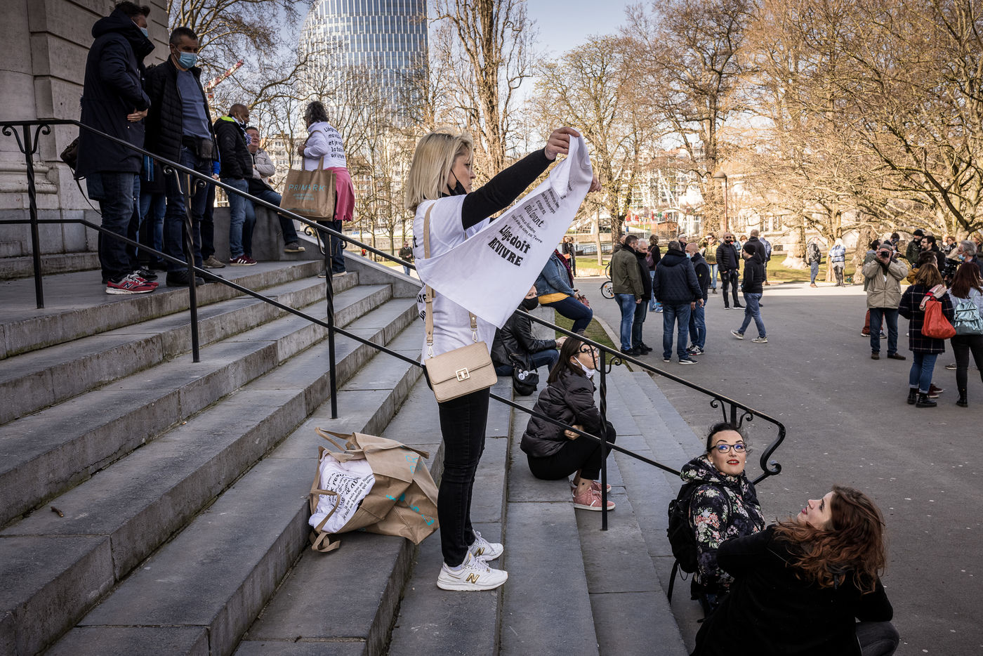 Liege, Belgique. 28 Mars 2021. Plusieurs centaines de personnes rassemblees au Parc de la Boverie afin de contester les nouvelles mesures anti-covid decidees par le gouvernement. Il s agit d un evenement repris sous un front commun de plusieurs associations dont de nombreux representants de l horeca.
