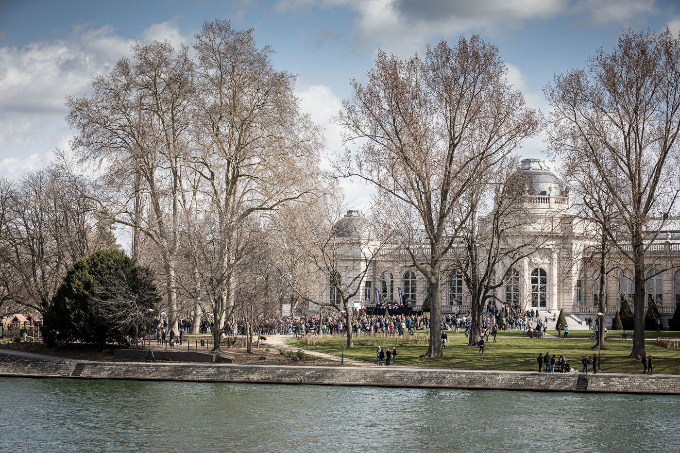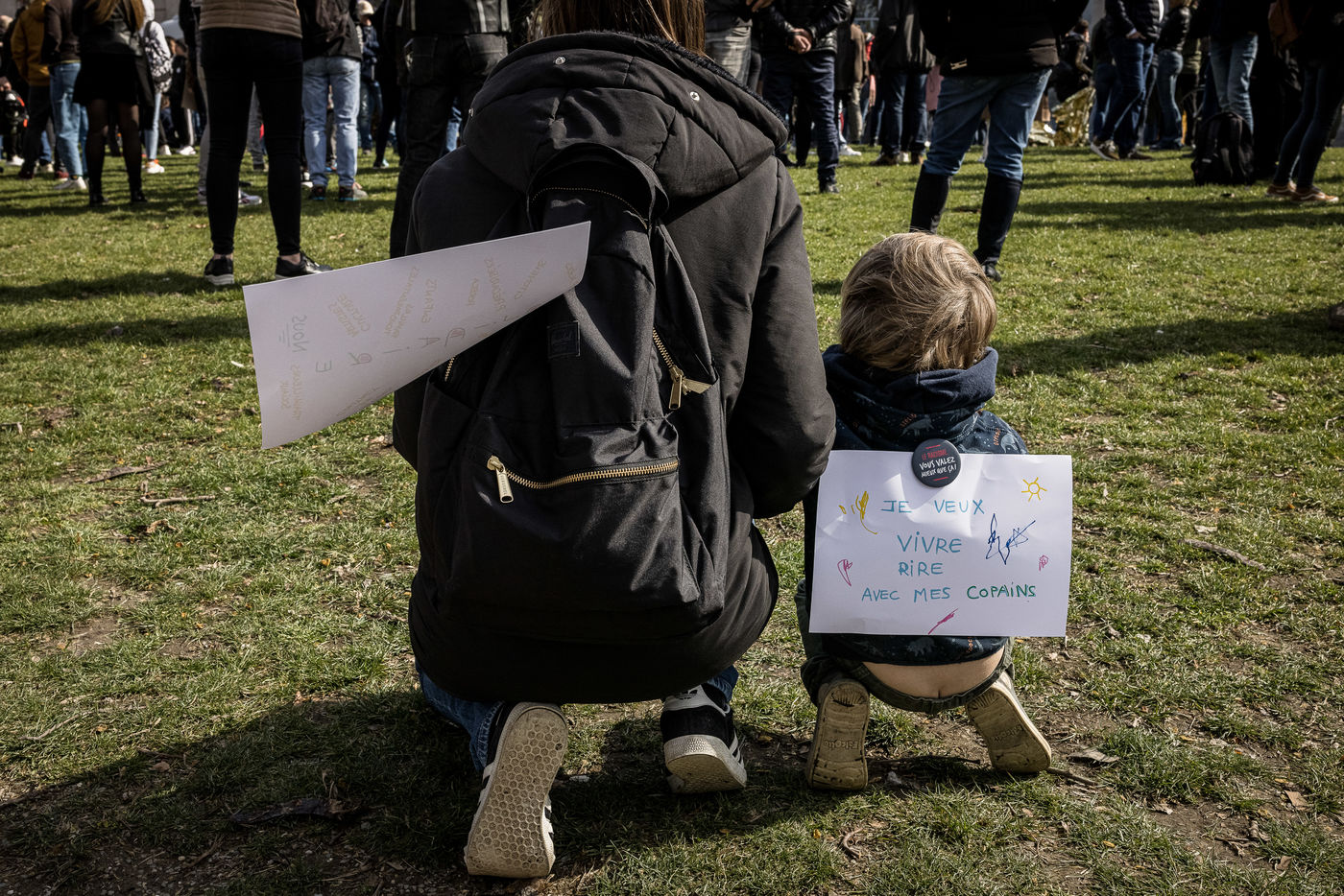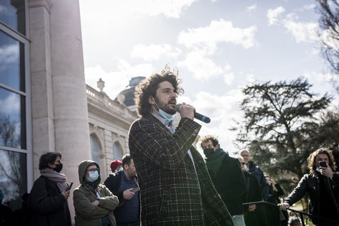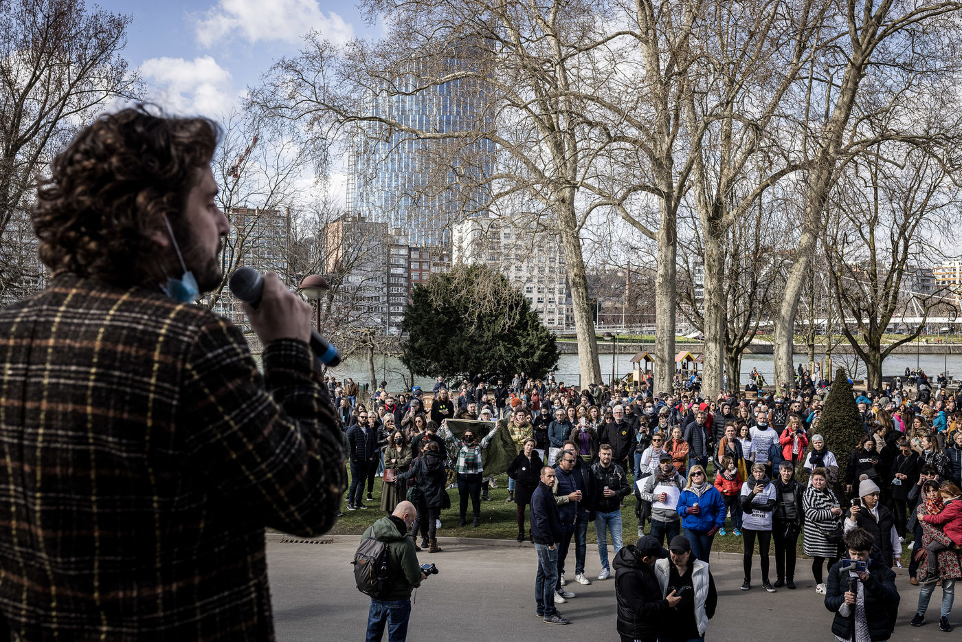 Liege, Belgique. 28 Mars 2021. Plusieurs centaines de personnes rassemblees au Parc de la Boverie afin de contester les nouvelles mesures anti-covid decidees par le gouvernement. Il s agit d un evenement repris sous un front commun de plusieurs associations dont de nombreux representants de l horeca.