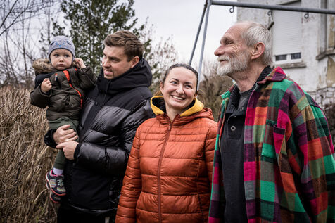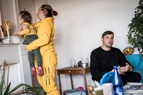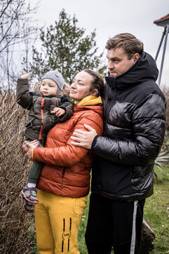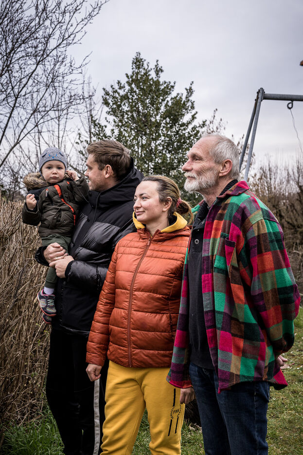 Namur, Belgium. 2023-02-17. Portrait of Anna, Volodymir and their son Ioann. A few weeks after the beginning of the war in Ukraine, they were welcomed in the house of Stephane Janne. Volodymir could even bring his parents a few months later.
