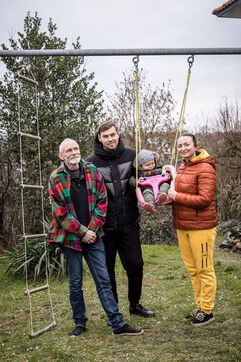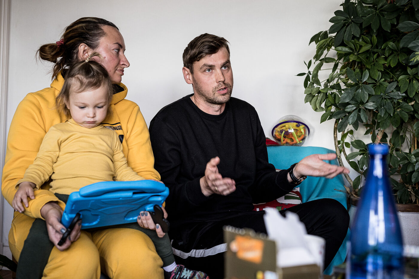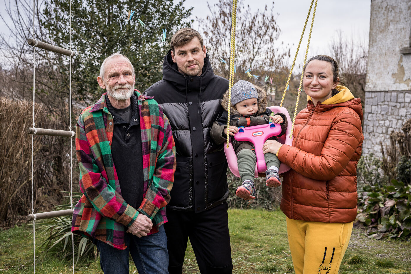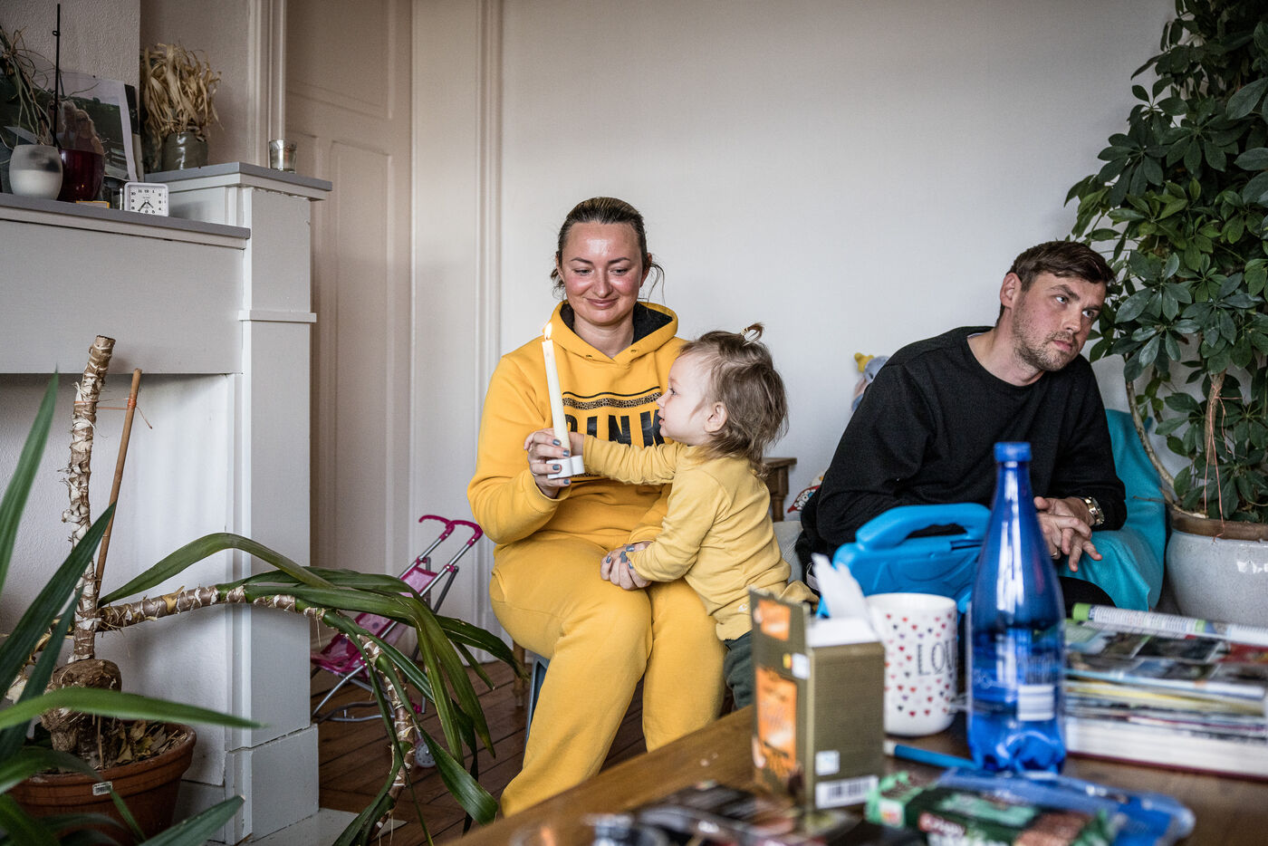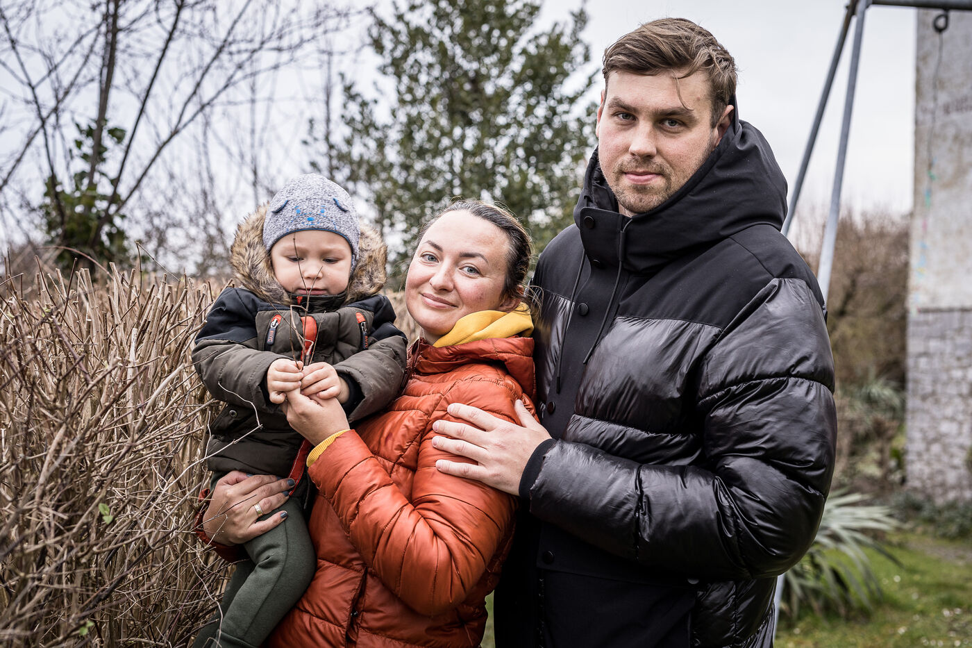 Namur, Belgique. 2023-02-17. Portrait d Anna, Volodymir et leur fils Ioann. Quelques semaines apres le debut de la guerre en Ukraine, ils ont ete accueilli dans la maison de Stephane Janne. Volodymir a meme pu faire venir ses parents quelques mois plus tard.