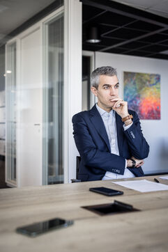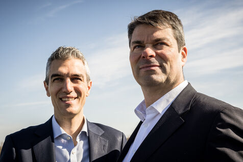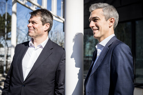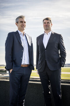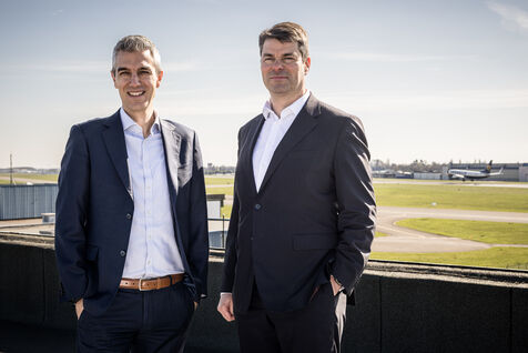 Gosselies, Belgium. 2023-04-04. Portrait of Yves Delatte, CEO of Sonaca and Stephane Burton, CEO of Orizio and Sabena Aerospace.