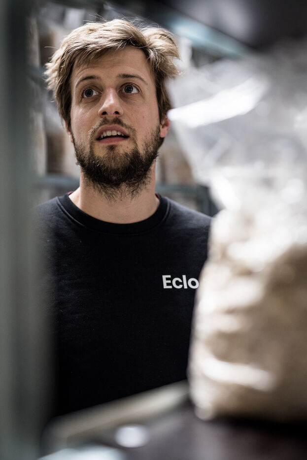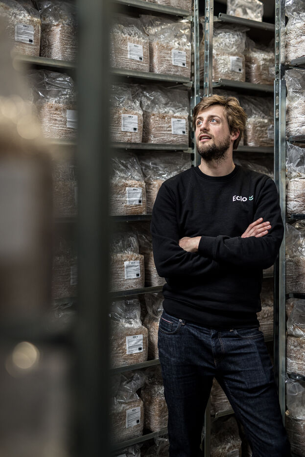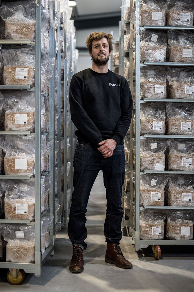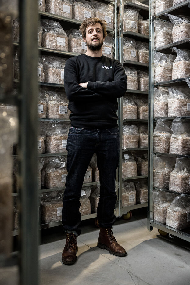 Villers-le-Bouillet, Belgique. 2023-04-24. Portrait d Hadrien Velge, CEO de l entreprise Eclo. Situee non loin de Liege, elle vient d ouvrir une usine de production de substrat pour la culture des champignons de differentes familles.