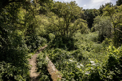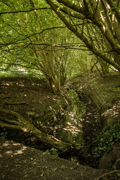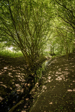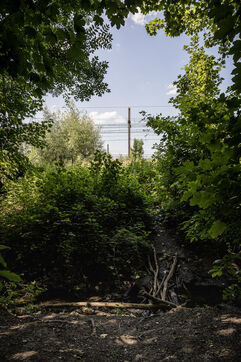 Evere, Belgium. 2023-07-07. The Kerkebeek river is unobtrusive near the railway line, overflown by planes arriving at Zaventem, its bed lost in lush nature.