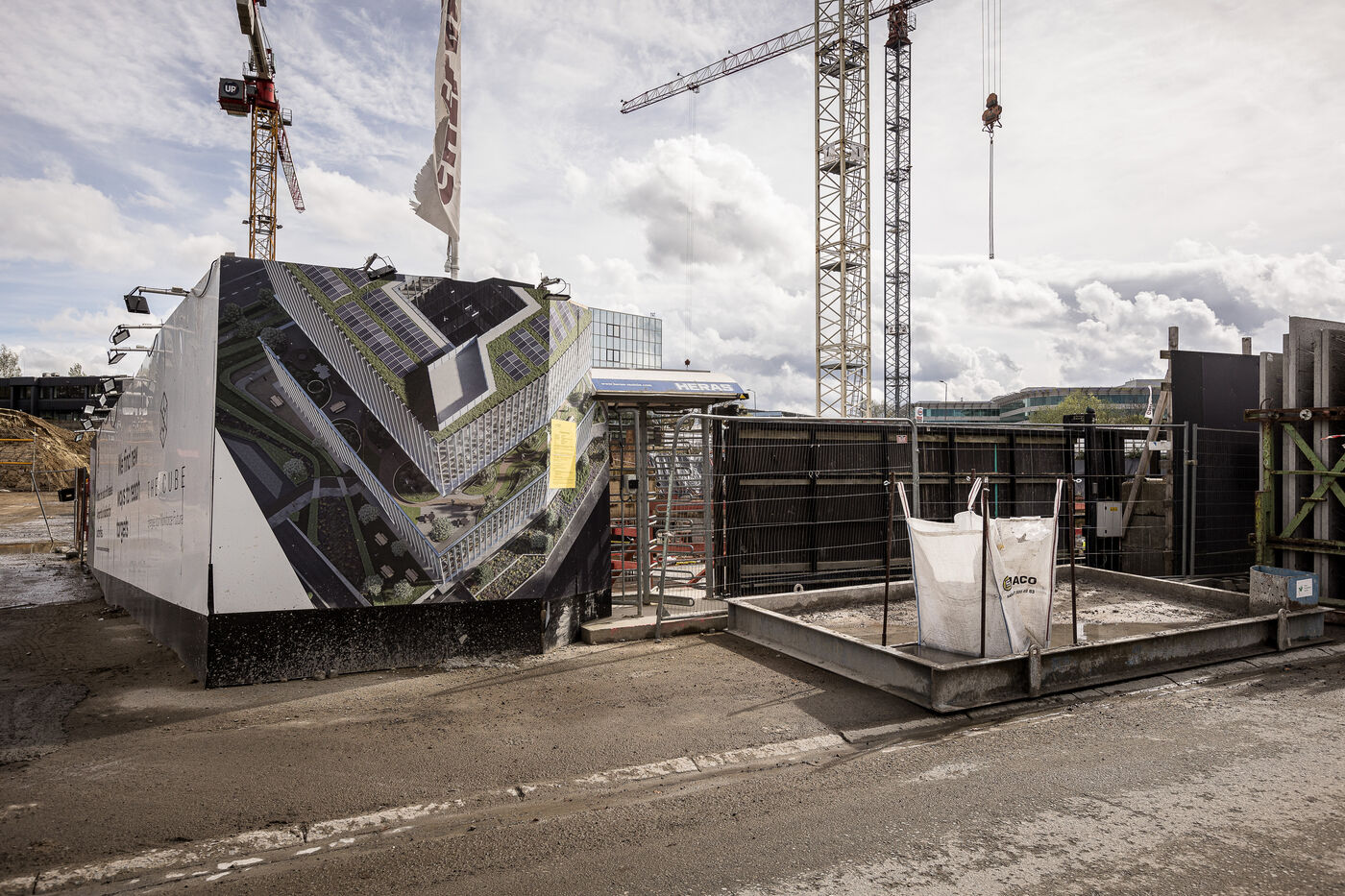 Machelen, Belgique. 2024-04-05. Batiment en construction, The Cube, realise par l entreprise Ghelamco. Photographie de Valentin Bianchi / Hans Lucas