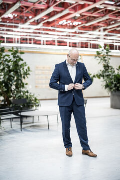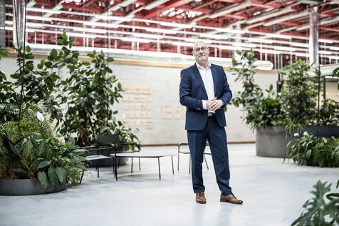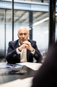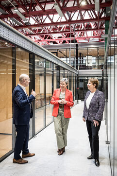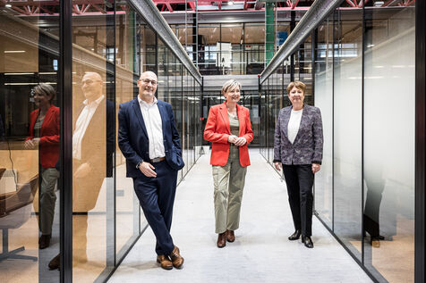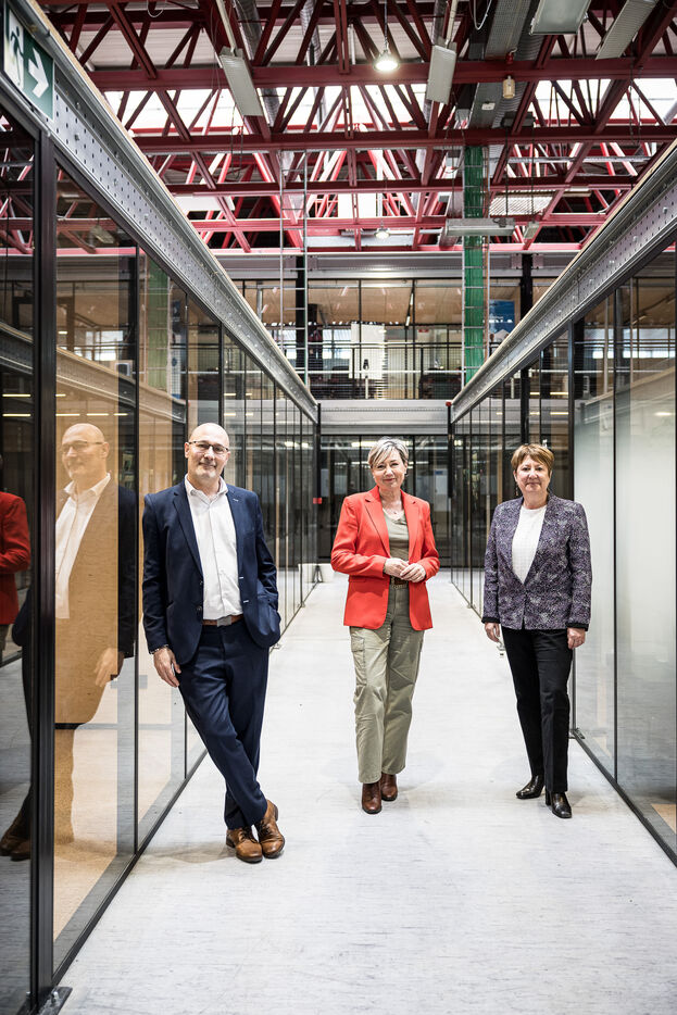 Charleroi, Belgium. 2024-04-25. Portrait of Celine Neven, CEO of UWE, Sylvie Marque, Secretary General of SPW and Lionel Bonjean, Director General of SPW Economy, Employment, Research. Photograph by Valentin Bianchi / Hans Lucas