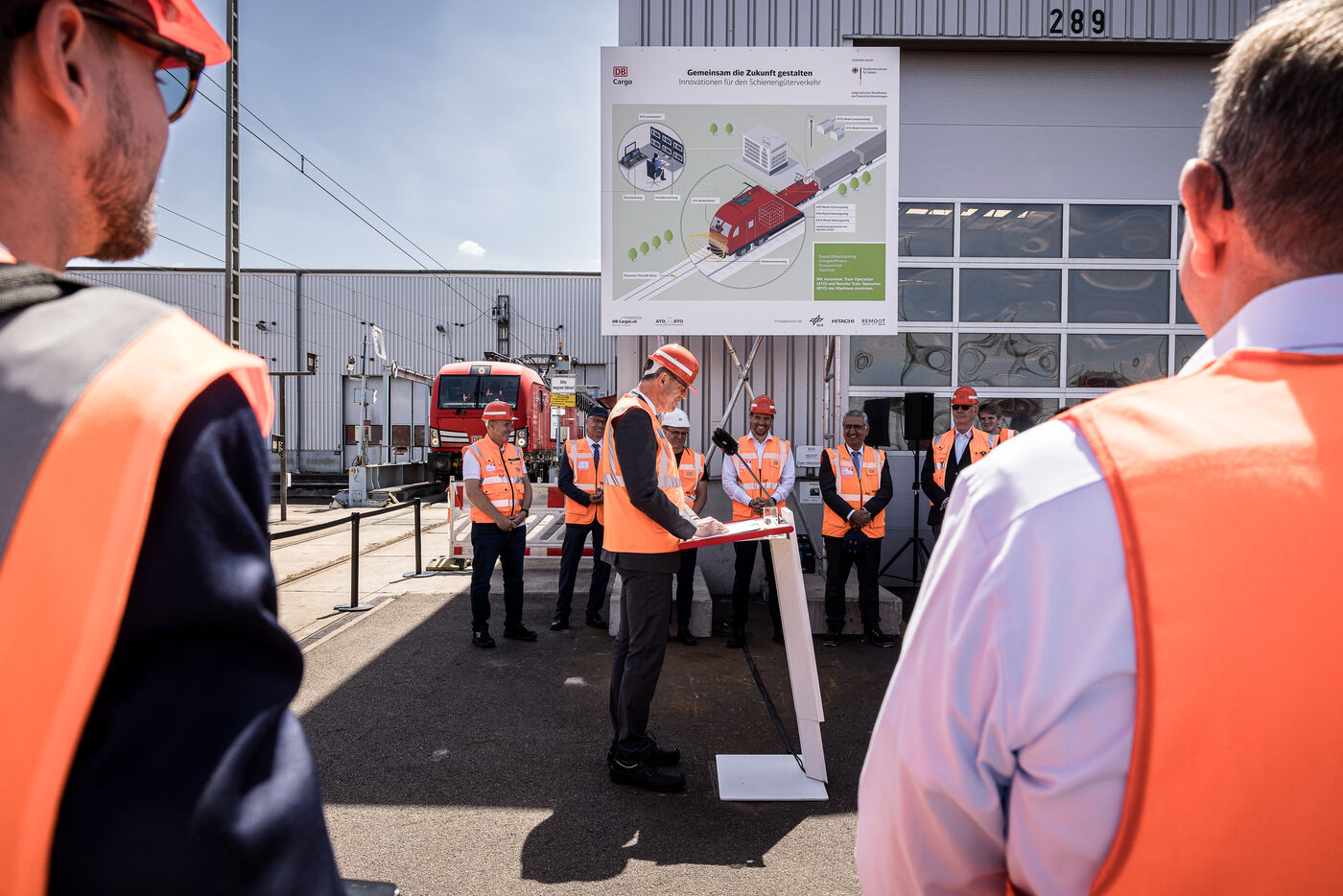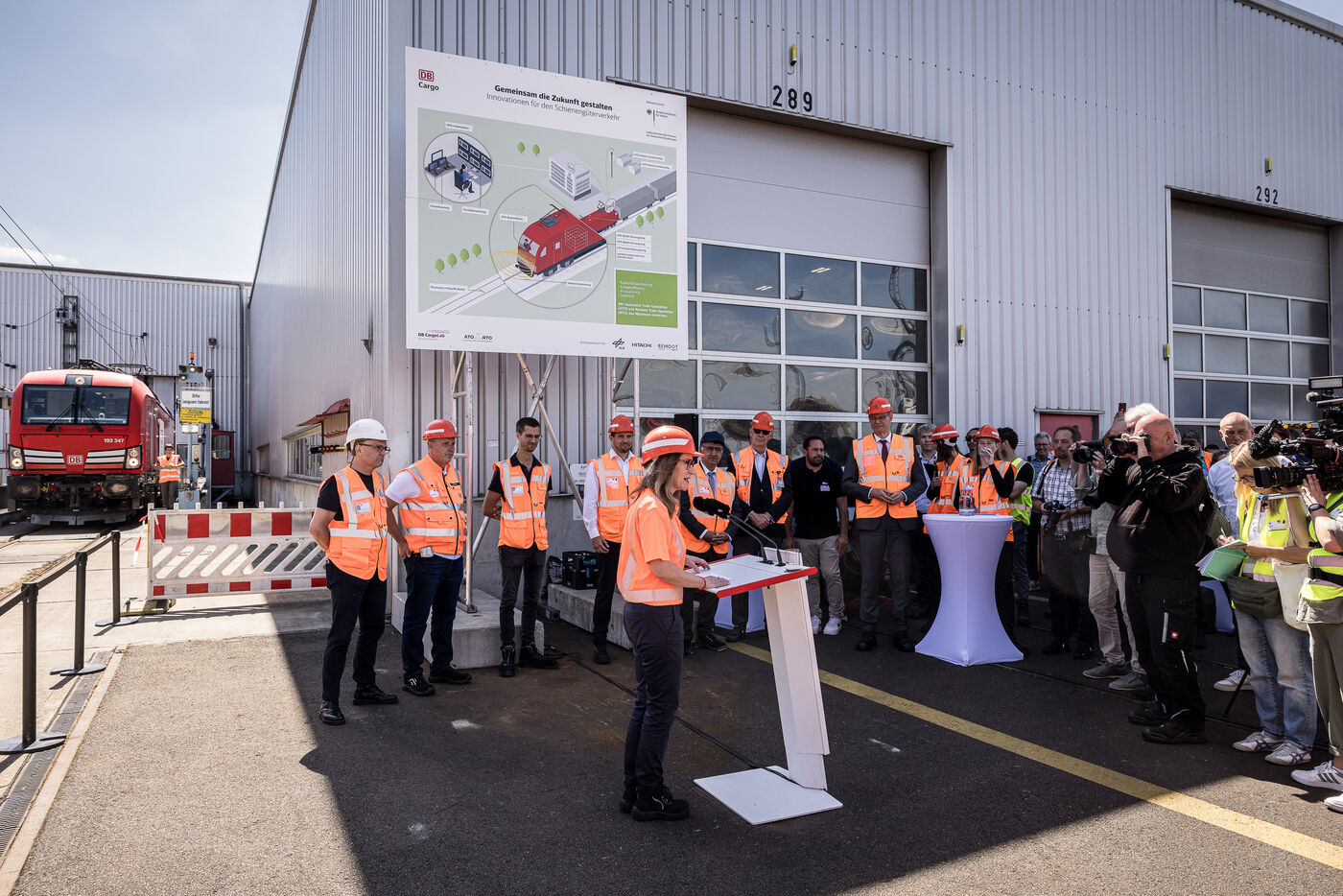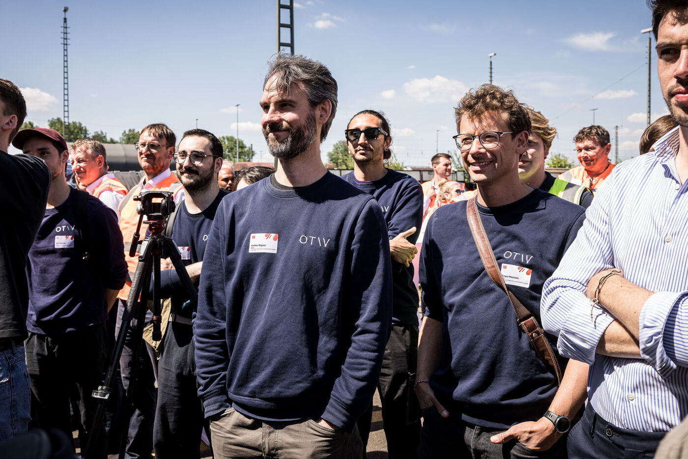 Otiv has developed the technology needed to launch the first automated freight train line with Deutsche Bahn. Inauguration in the presence of the team and the German Minister of Transport, Patrck Schnieder, in Koln, Germany, July 4, 2025.